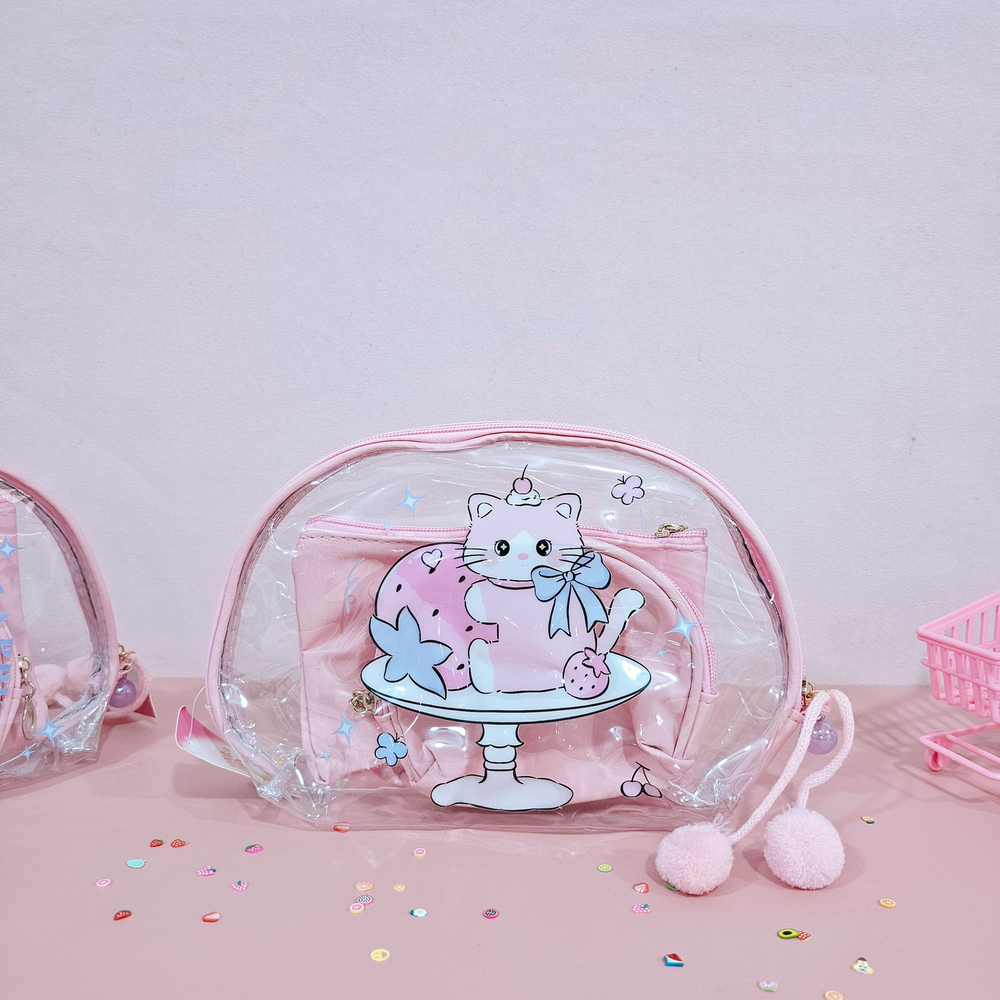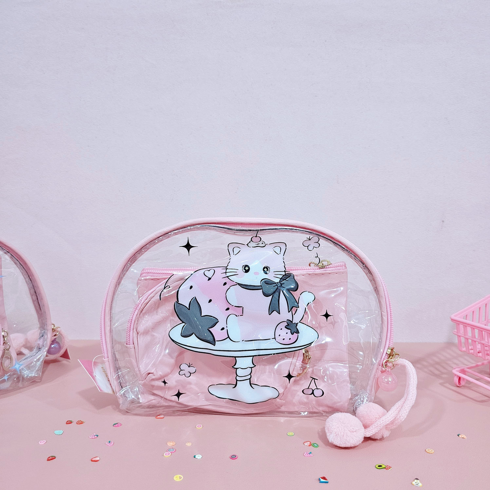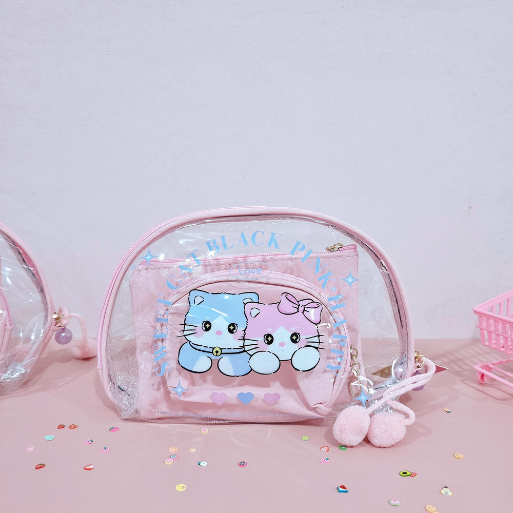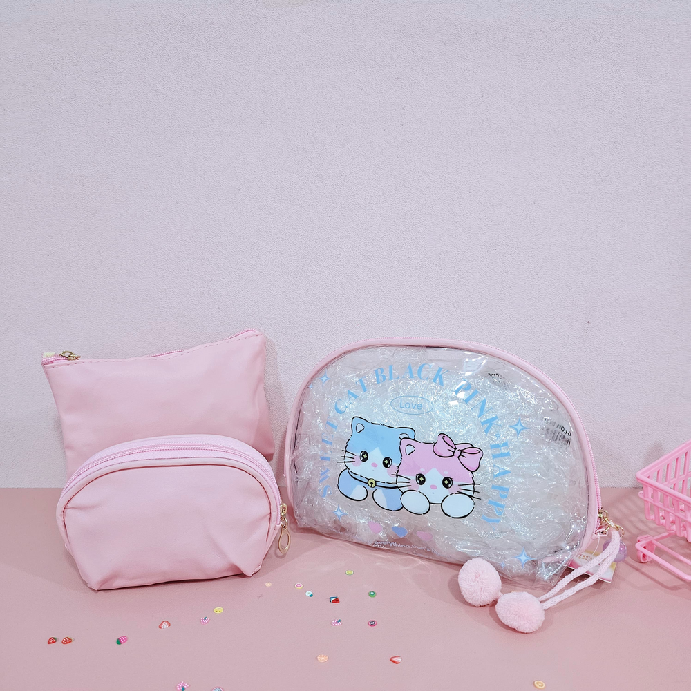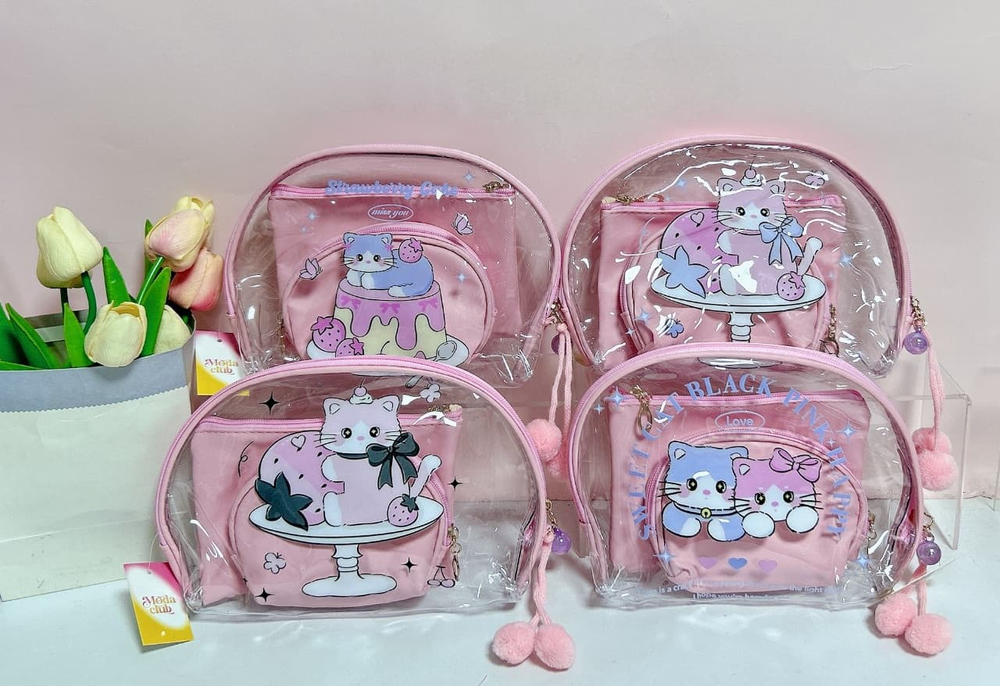 (Portacosmetico x 3U. En color rosa con diferentes diseños de gatitos. Ideal para almacenar lo que desees).