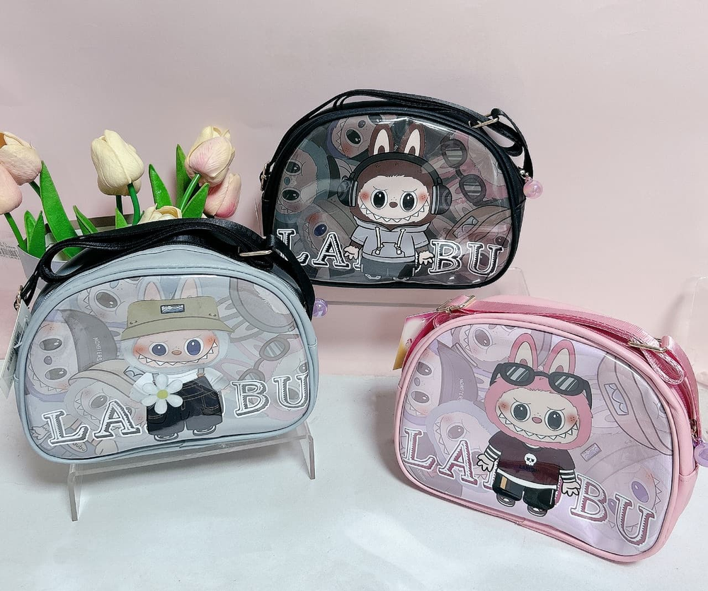 (Bandolera Labubu con correa ajustable y un dije en su cierre, disponible en tres colores con diferentes diseños . Ideal para niños).