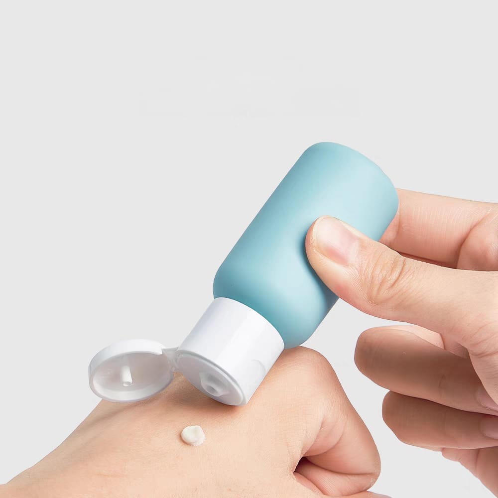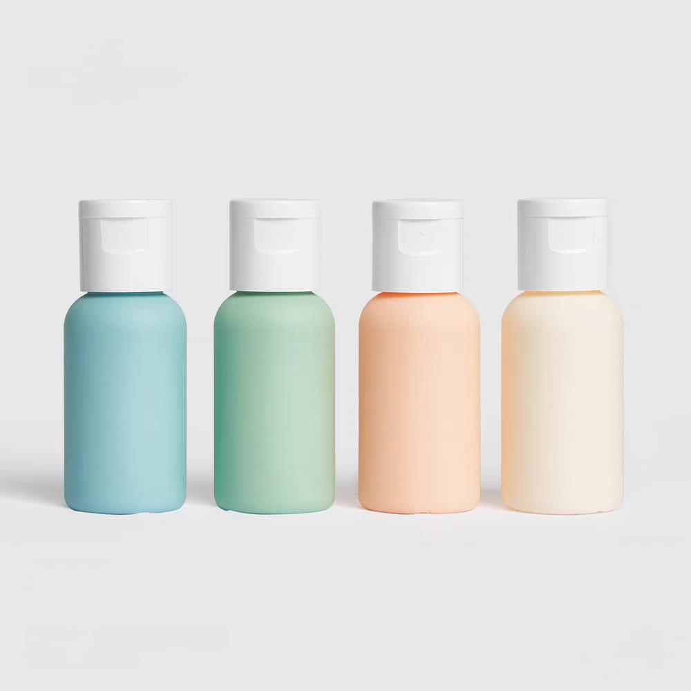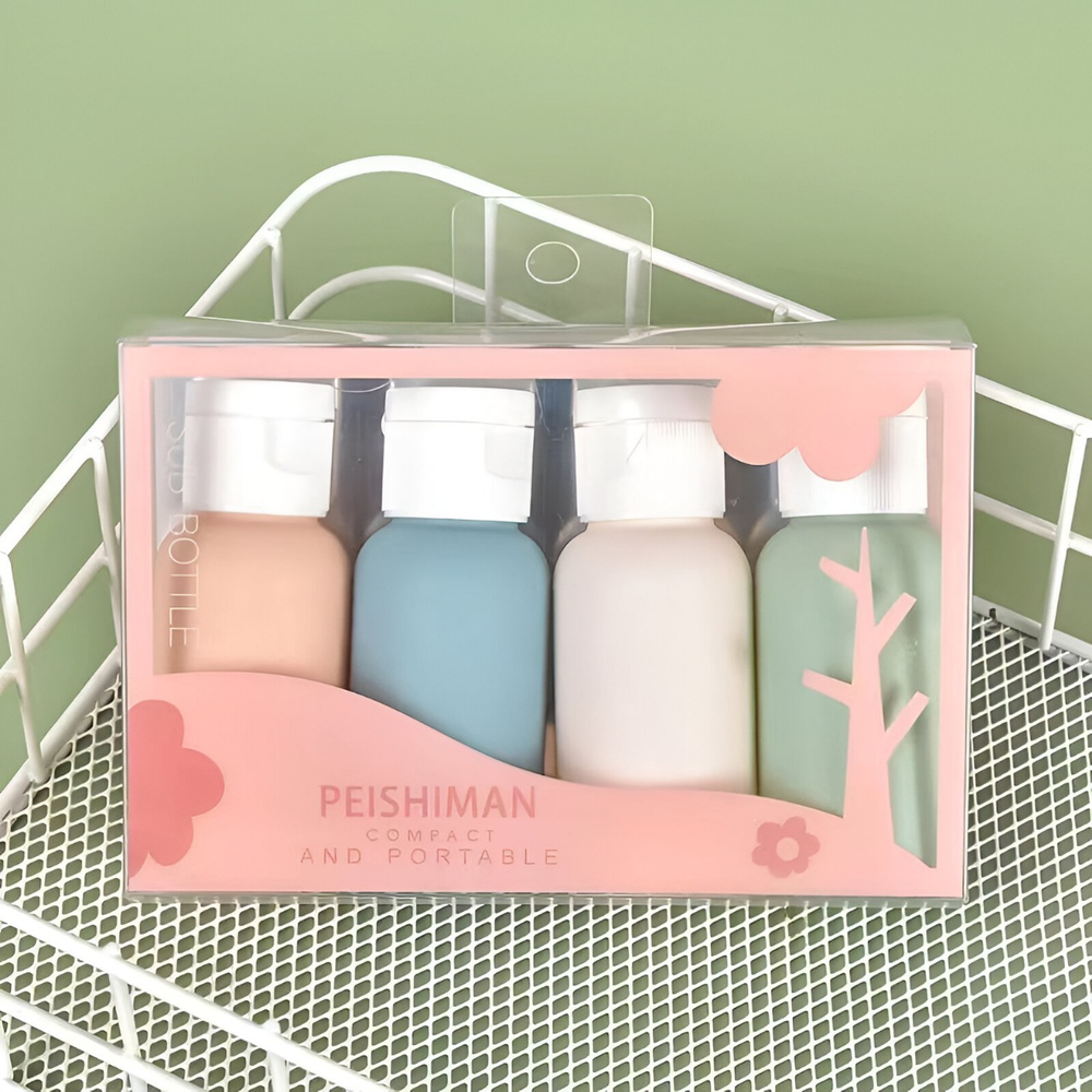 (Set x 4U. Neceser de viaje, que cuenta con 4 envases de diferentes colores que son un material de plástico, ideal para poder sacar el producto fácilmente presionándolo. Son super útiles a la hora de llevarlos de viaje, ya que por su tamaño no ocupan espacio).