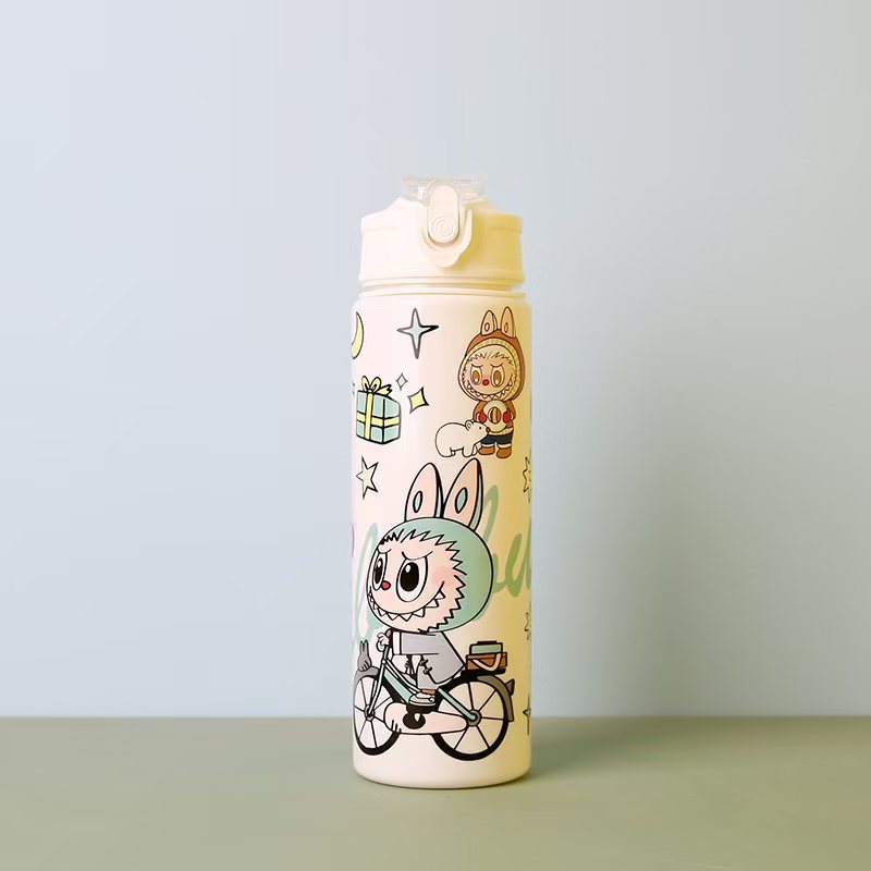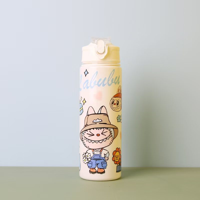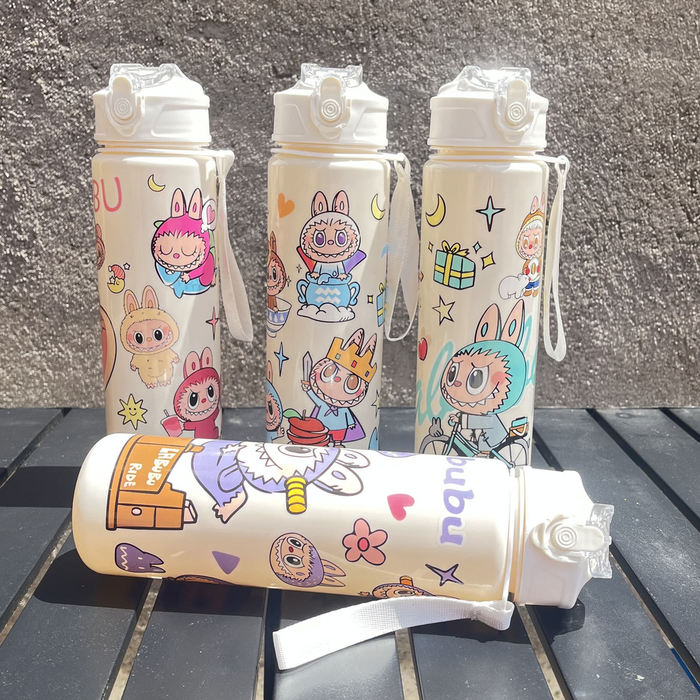 (Botella plástica disponible en varios colores con diseño de labubu cuenta con pico, tapa a rosca y una corre para que sea fácil de llevar a cualquier lado).