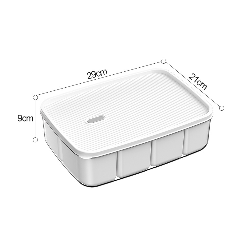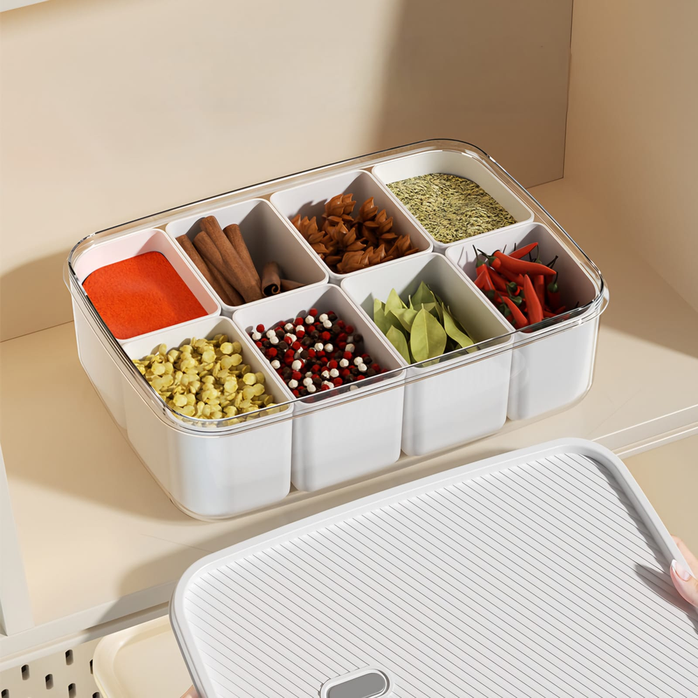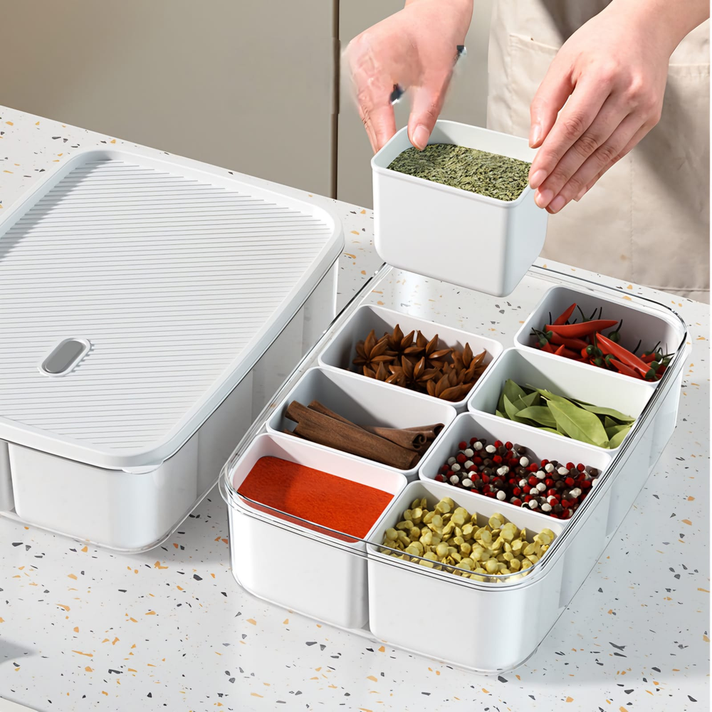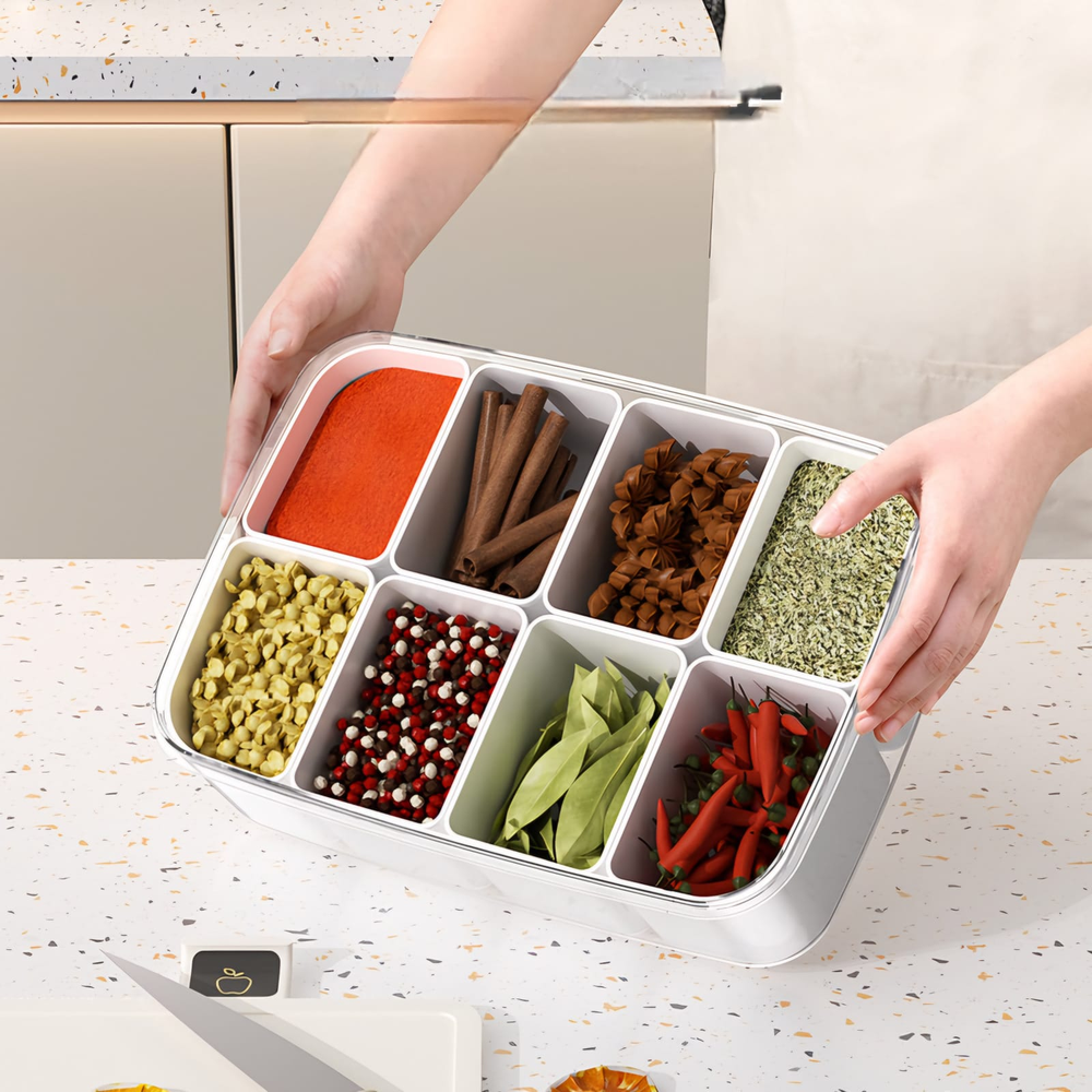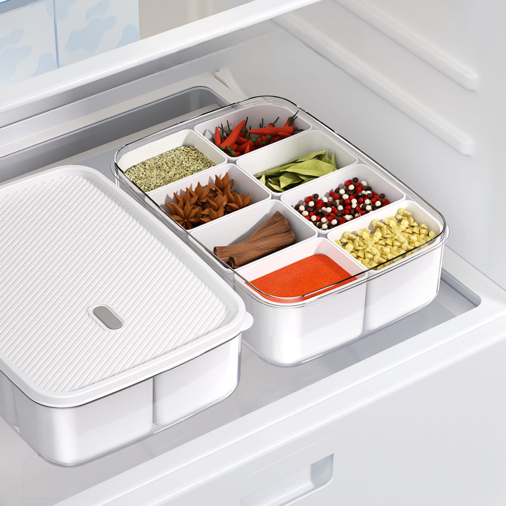 (Organizador de alimentos con compartimentos para heladera. Este tipo de contenedor está diseñado para mantener los alimentos frescos y organizados dentro del refrigerador o la despensa. Cuenta con múltiples compartimentos para separar diferentes tipos de alimentos, como especias, frutos secos, o ingredientes pequeños. Incluye una tapa para sellar y mantener la frescura).