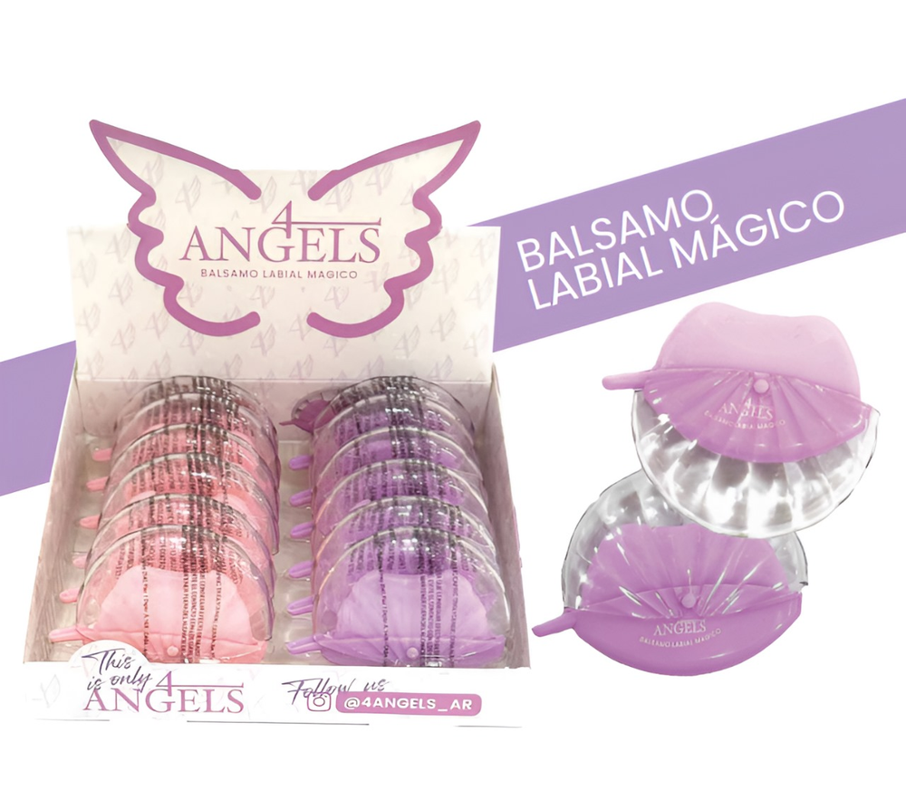 (Caja x12U. Bálsamo Labial "4 Angels" . Este bálsamo cuenta con dos modelos diferentes, con un riquísimo aroma. Ideal para hidratar tus labios y dejarles un colorcito natural).