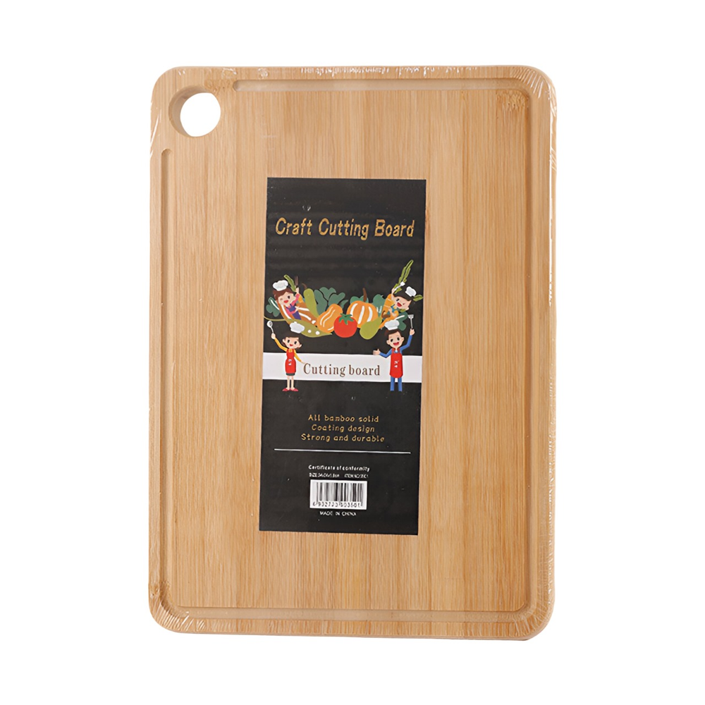 (Tabla para picar de madera grande con forma rectangular sus puntas redondeadas y además cuenta con un agarradera de plástico para sujetarla).