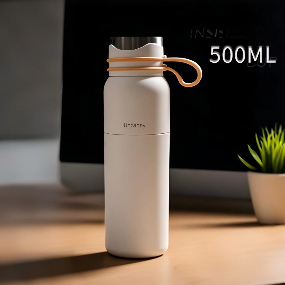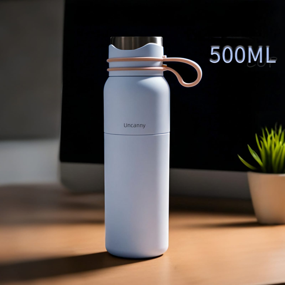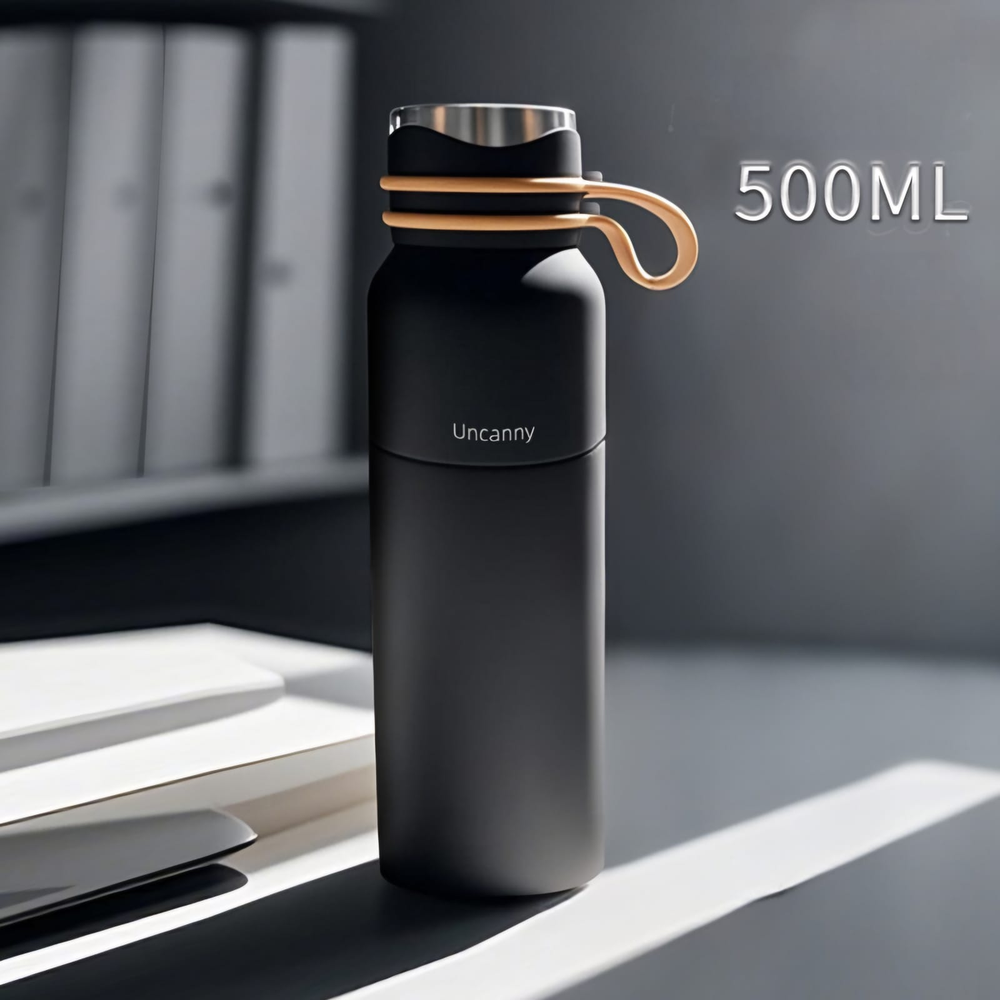 (Botella térmica de 500ml de acero inoxidable, especial para colocar tus bebidas frías o calientes, de larga duración, cuenta con manija para poder llevarla cómodamente . Vienen varios colores).