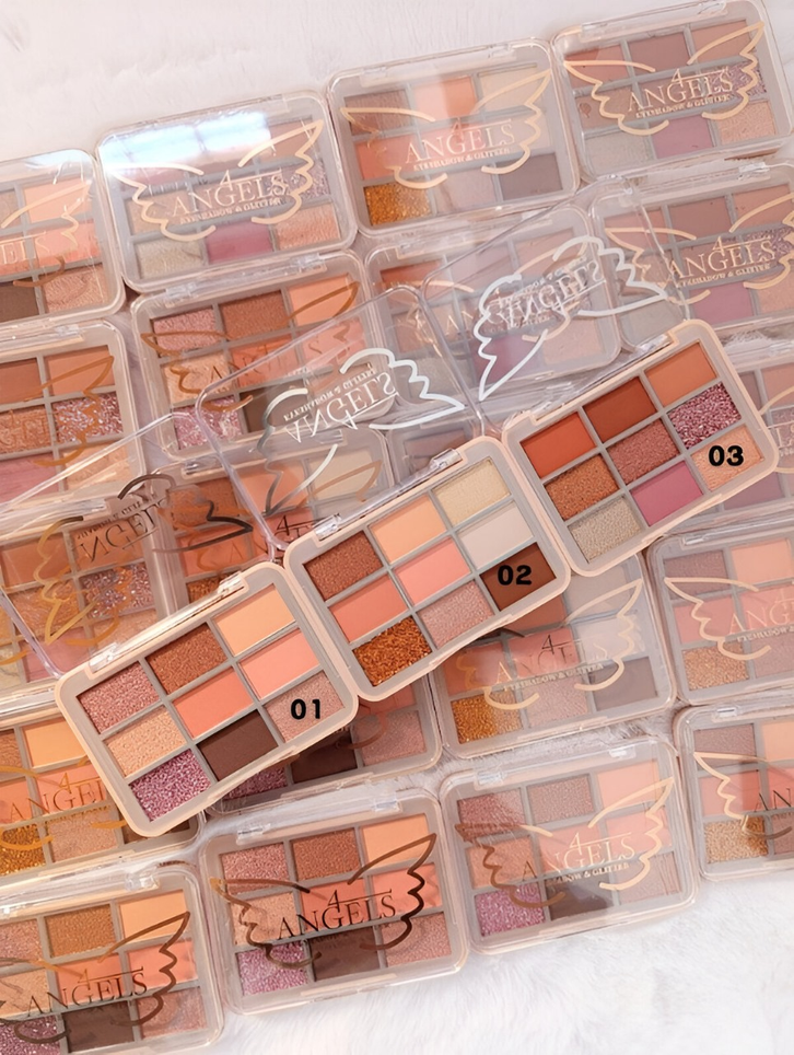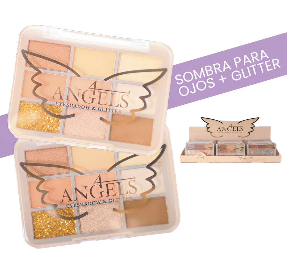(Paleta de Sombras y Glitter "4 Angels". Estas sombras cuentan con 3 opciones diferentes a elección. Tienen acabado matte y glitter. Ideal para que no falte en tu maquillaje).