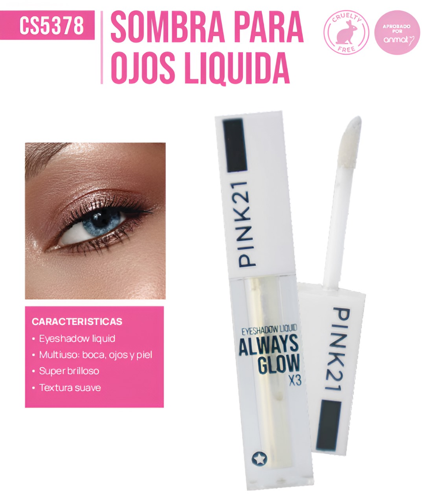 (Sombra para Ojos Líquida "Pink 21". Estas sombras cuentan con un pigmento increíble y tienen 6 tonos diferentes a elección. Ideal para dejarle un brillo único a tus ojos).