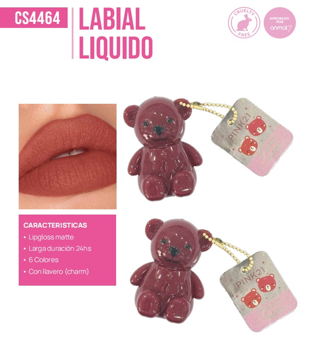 (Labial Líquido Osito Matte "Pink 21". Estas pinturas cuentan con 6 opciones diferentes a elección. Ideales para poder tener tus labios pintados con una duración larga. Cuenta con un colgante ideal para poder llevarlo donde quieras).