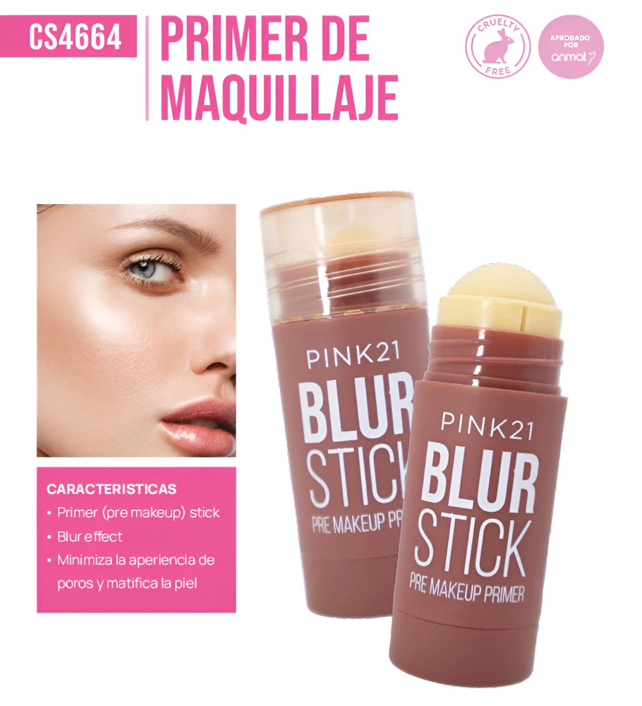 (Primer Blur Stick "Pink 21", es ideal para usarlo como pre-base, ayuda a que la piel sea bien preparada, con mayor duración y mejor maquillada, dándole un toque natural. Ideal para tus maquillajes).