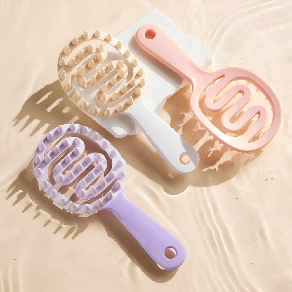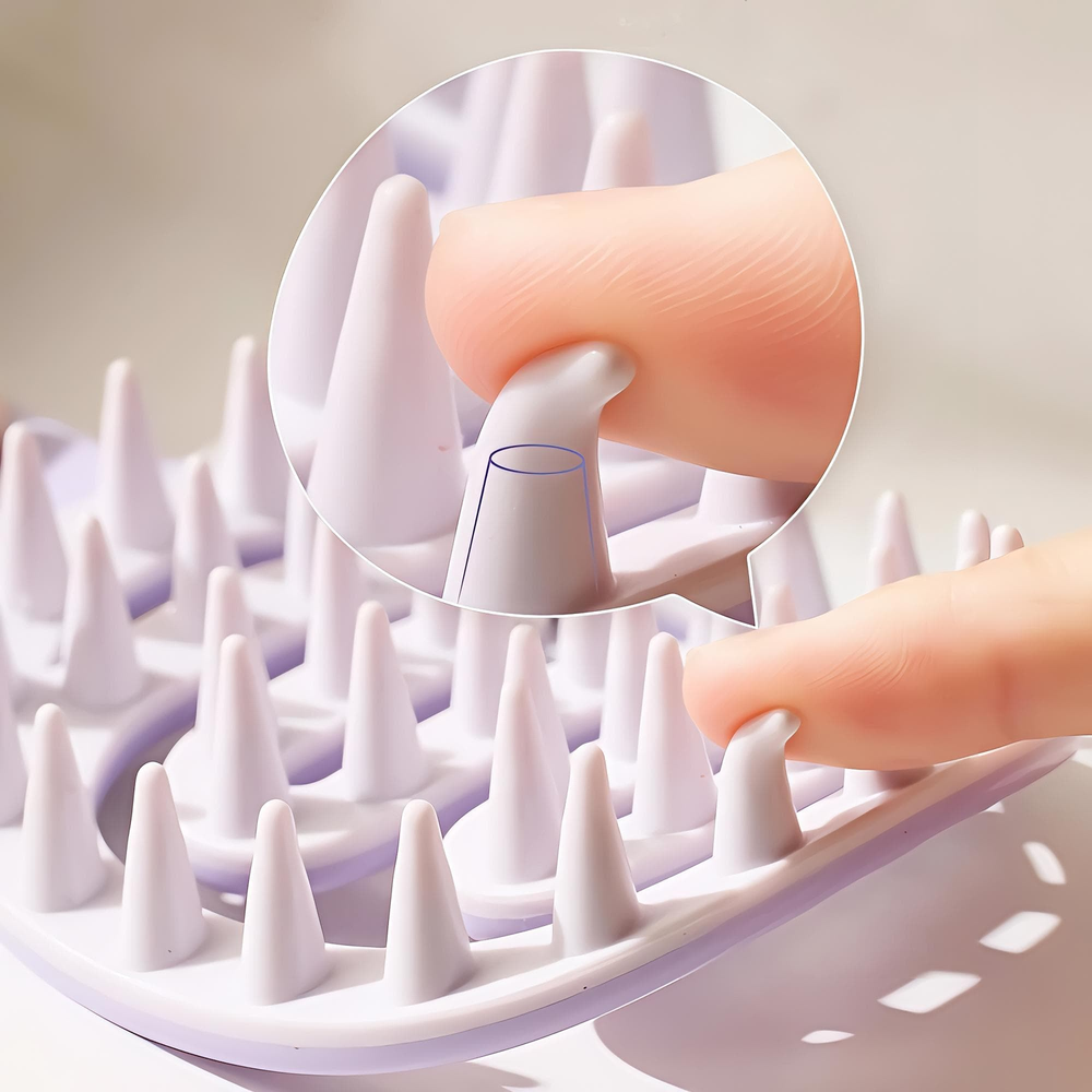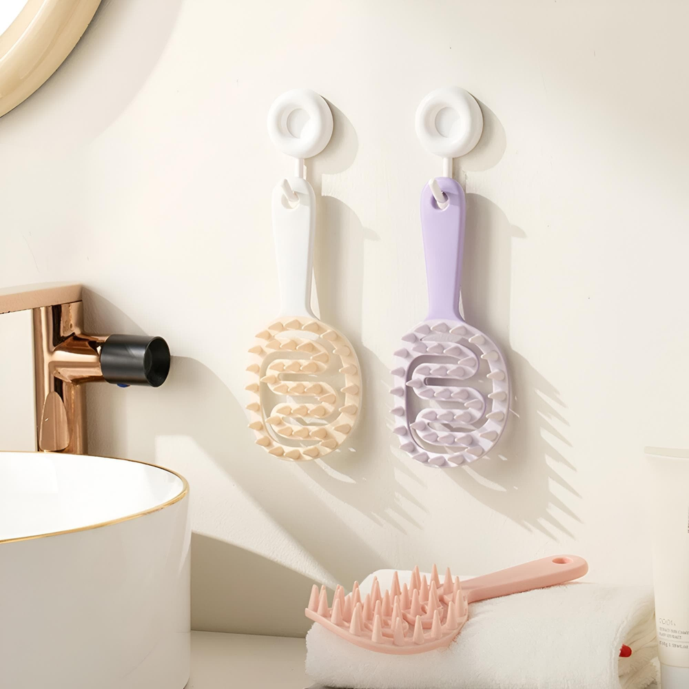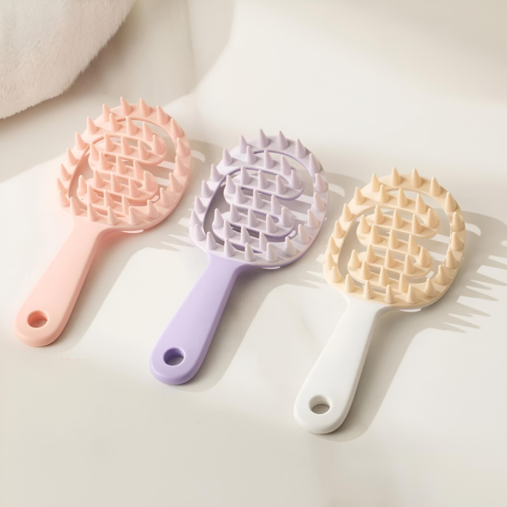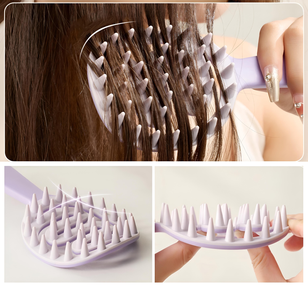 (Cepillo masajeador capilar o para el cuero cabelludo, que se utiliza para estimular la circulación sanguínea y proporcionar una sensación relajante. Se puede usar durante la ducha con o sin champú para ayudar a eliminar residuos y células muertas del cuero cabelludo. Al mejorar la circulación y la salud del cuero cabelludo, puede favorecer un crecimiento capilar más fuerte y sano. El masaje en el cuero cabelludo ayuda a relajar y aliviar la fatiga. Se puede utilizar tanto en seco para masajes relajantes como en la ducha para una limpieza profunda).