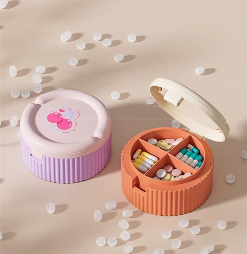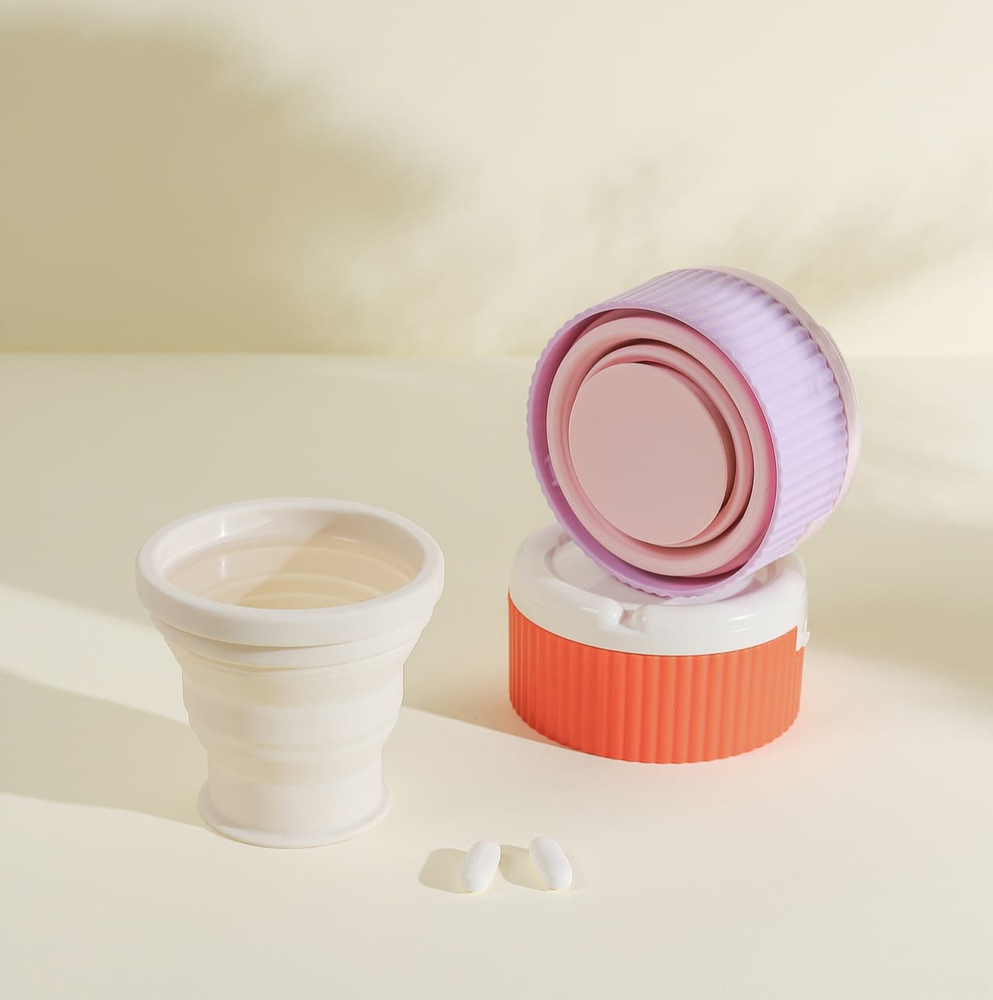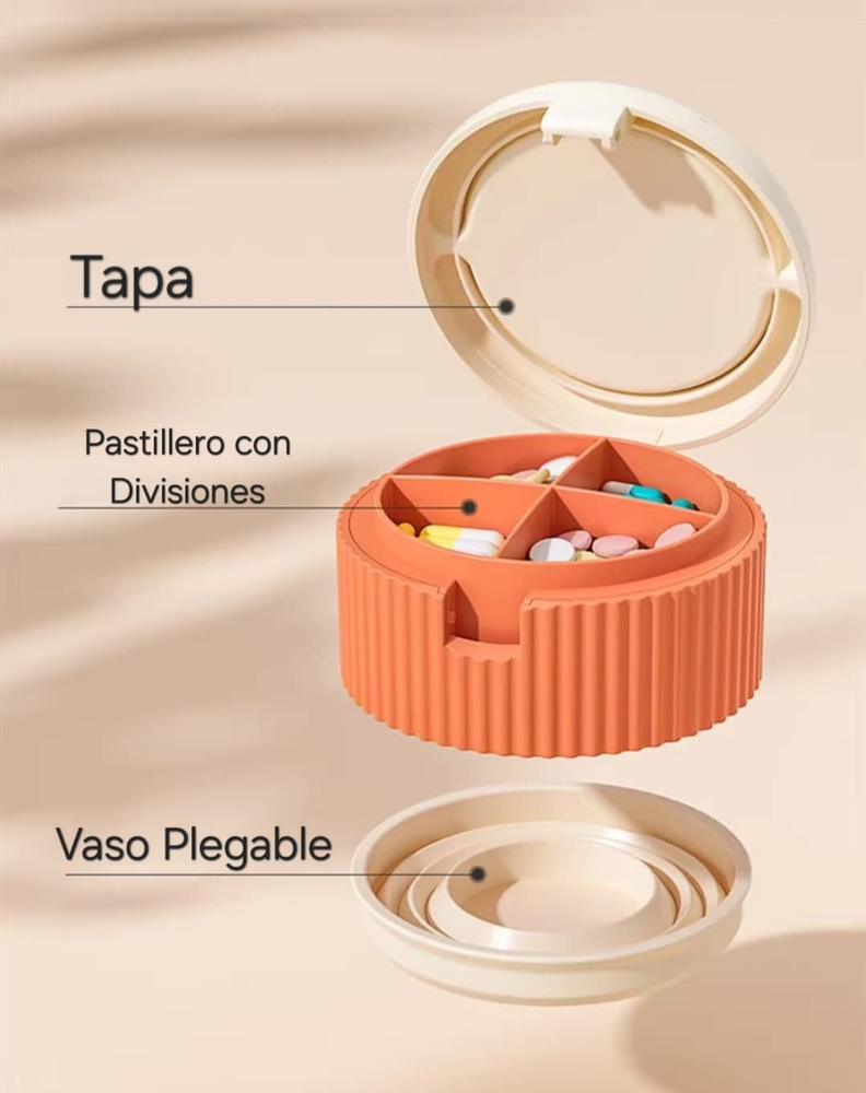 (Pastillero con 4 divisiones, cuenta con vaso de agua plegable. Disponible en dos opciones).