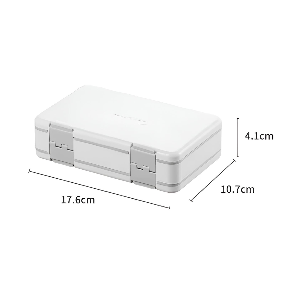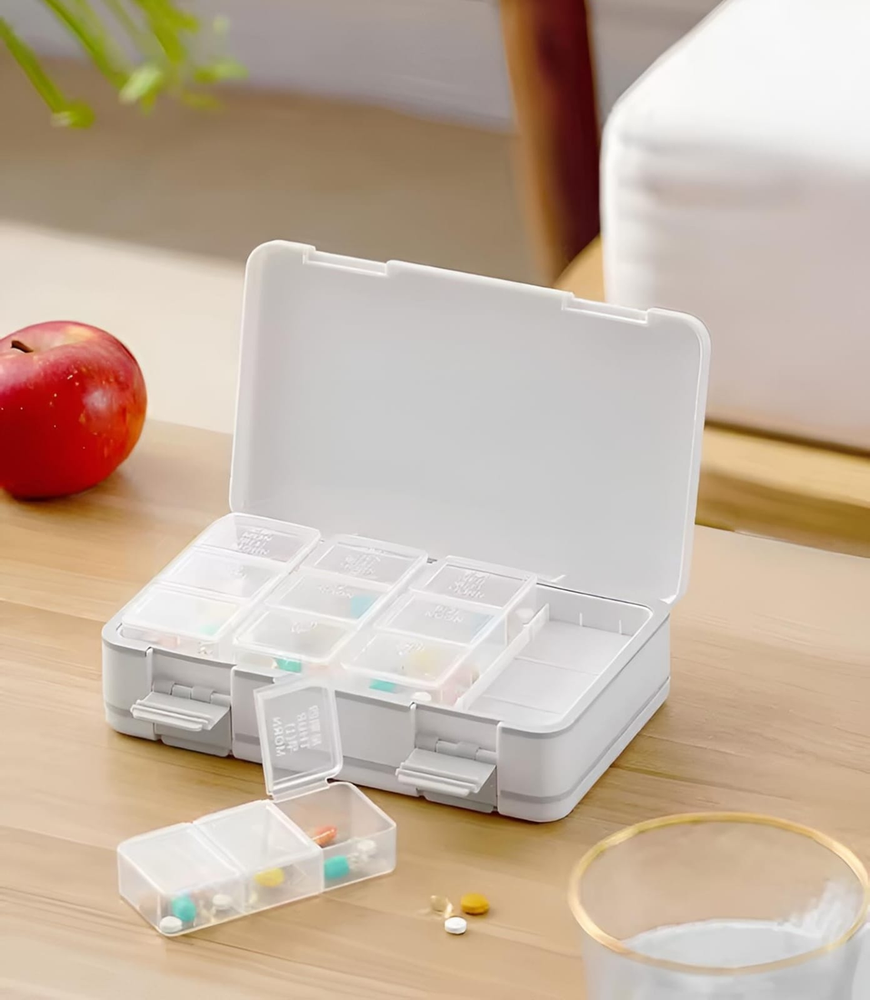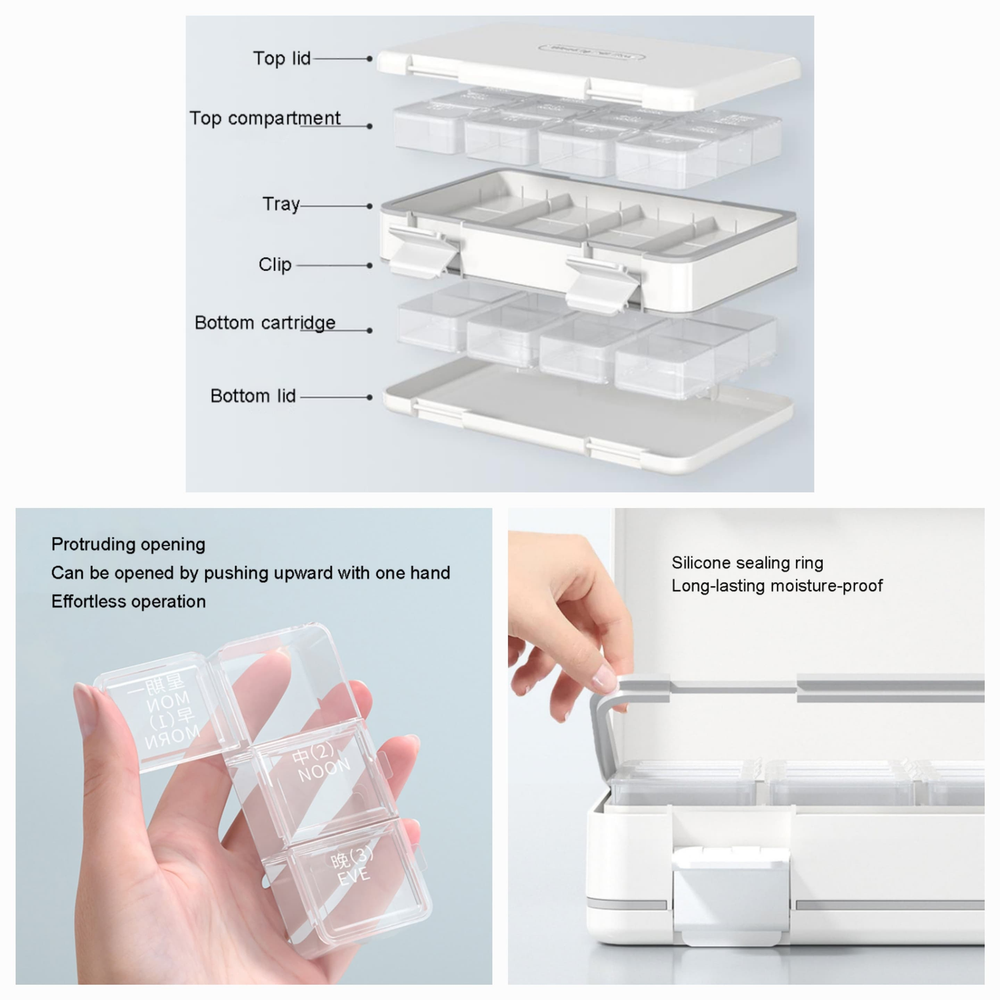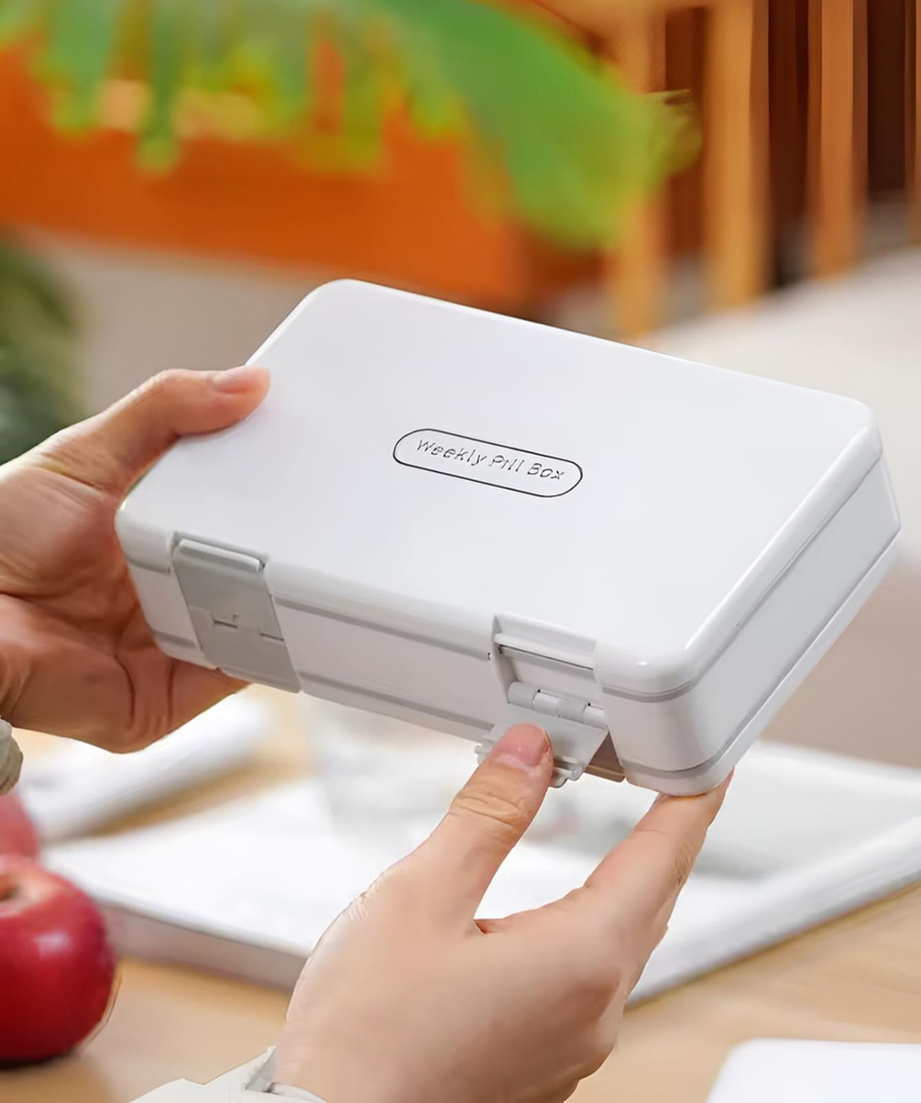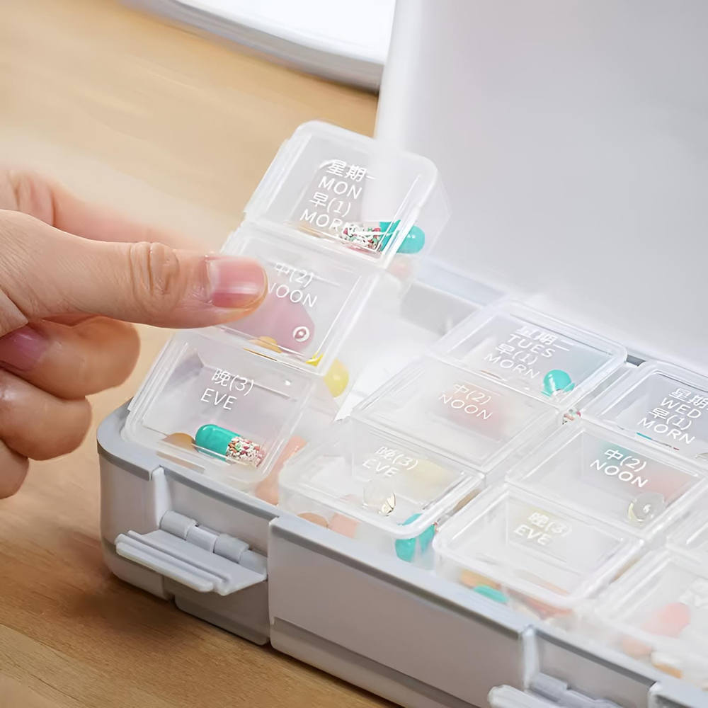 (Es un organizador de pastillas de 7 días, con compartimentos para la mañana, mediodía y noche, lo que permite organizar la medicación para toda la semana. Cuenta con un diseño desmontable, lo que permite llevar solo los días necesarios al viajar, reduciendo la carga del equipaje. Tiene doble protección con cierres seguros tanto en la caja exterior como en los compartimentos internos, y un anillo de sellado de silicona para mantener las pastillas secas y limpias. Cada compartimento tiene una capacidad generosa, pudiendo contener varias pastillas o suplementos grandes). Ut.20