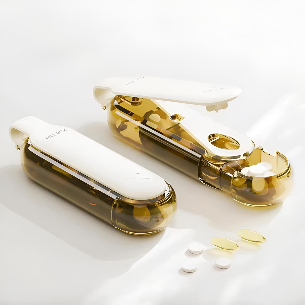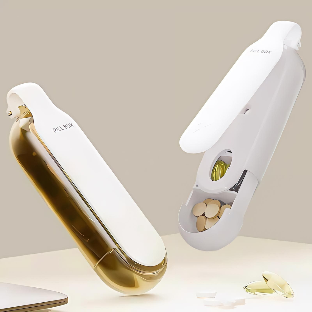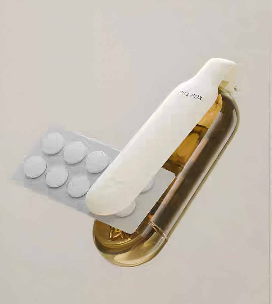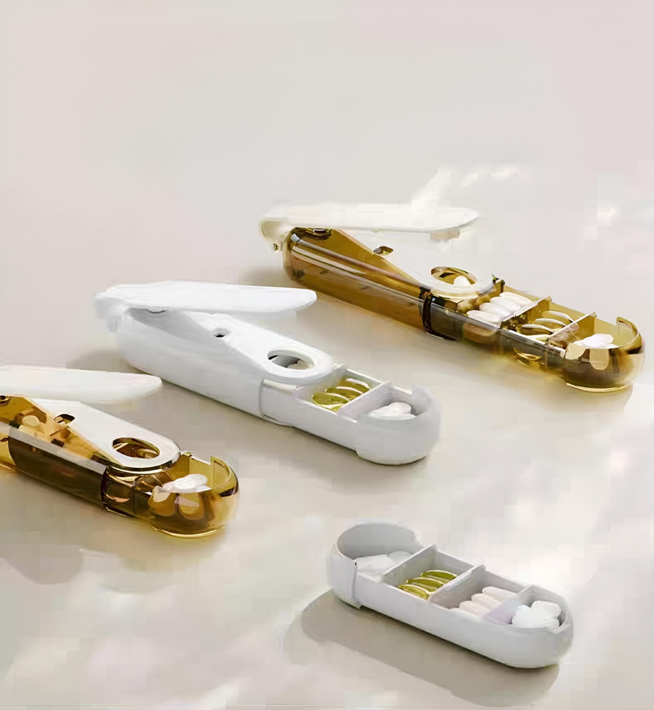 (Dispositivo que combina la función de extraer pastillas de su tableta y un organizador para almacenar las dosis de medicamentos. Permite una extracción fácil e higiénica de las pastillas, y su diseño en capas ayuda a organizar la medicación. Es útil para personas que necesitan tomar varios medicamentos y desean una forma sencilla y organizada de hacerlo). Ut.20