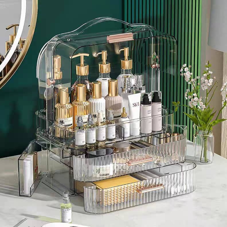 (Sirve para almacenar y organizar productos de maquillaje y cuidado de la piel, como cremas, lociones, sueros, maquillaje, etc. Mantener los productos ordenados y accesibles, facilitando su uso diario. Proteger los productos del polvo y la humedad, especialmente aquellos con tapa o compartimentos cerrados. Optimizar el espacio en tocadores, baños o cualquier área de belleza).