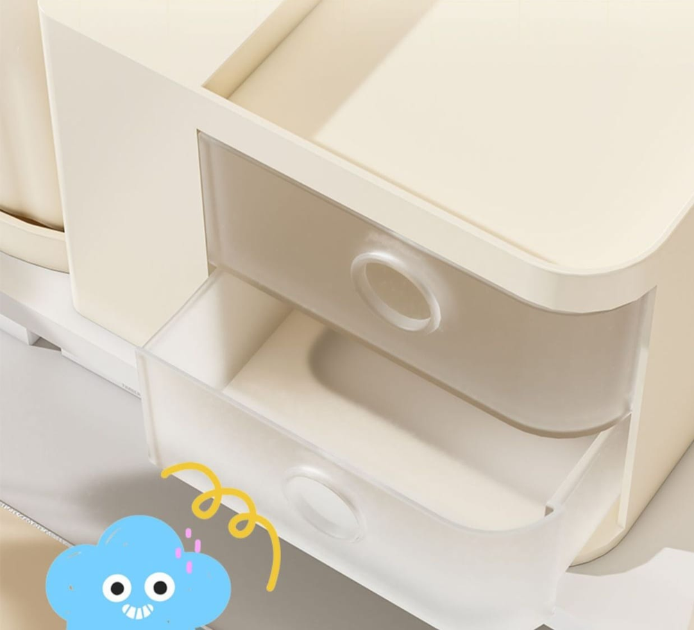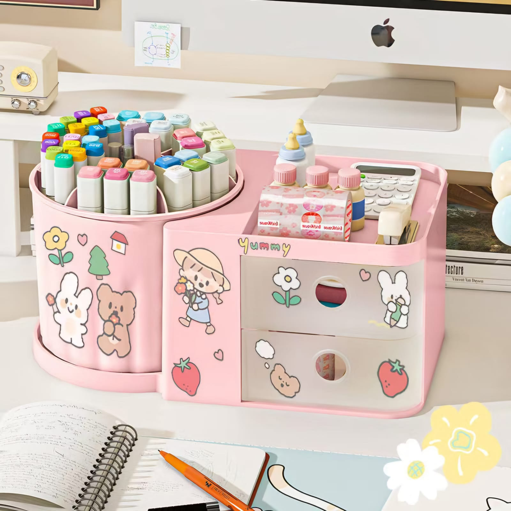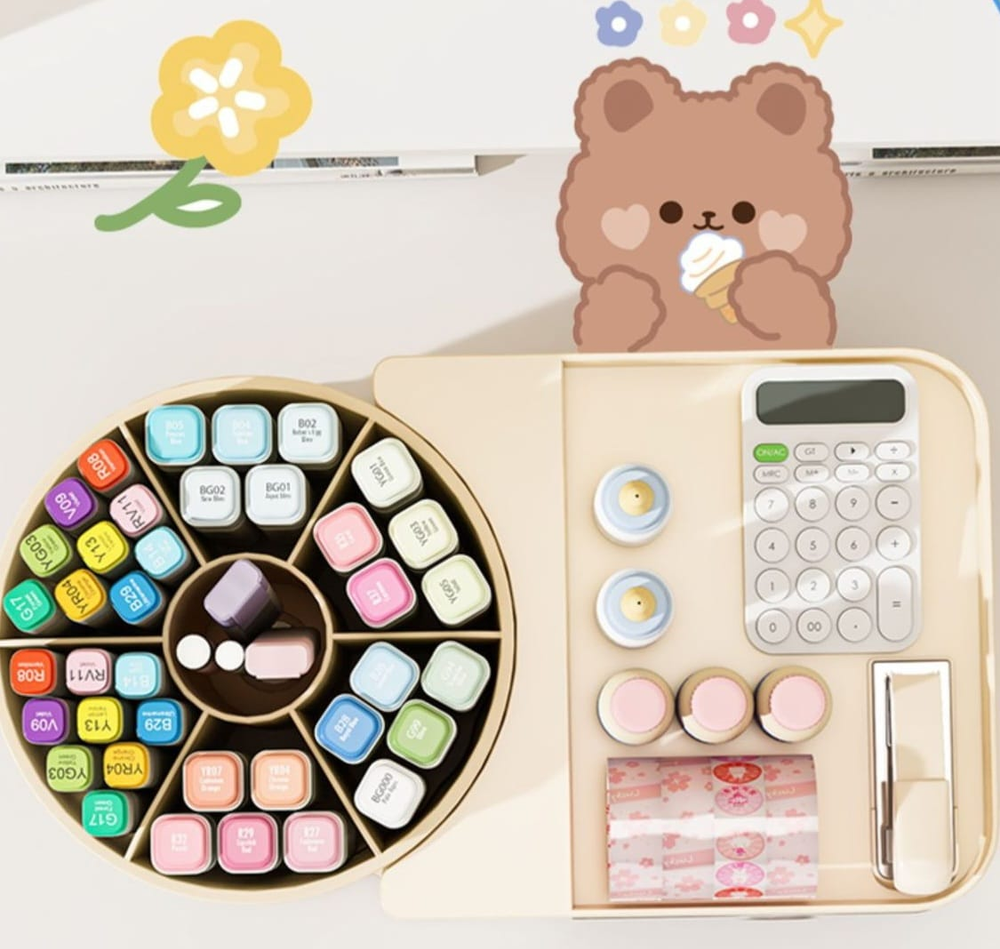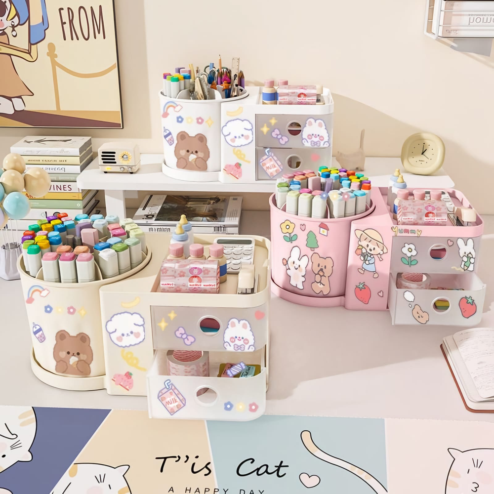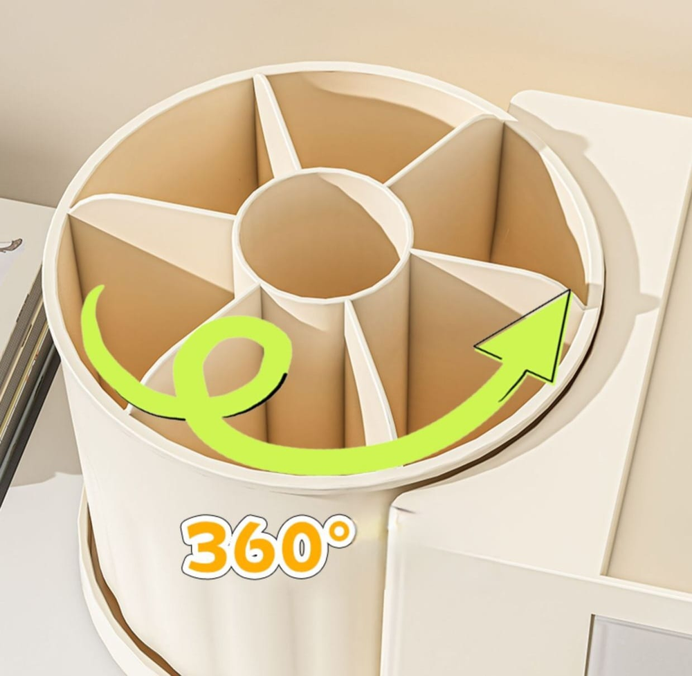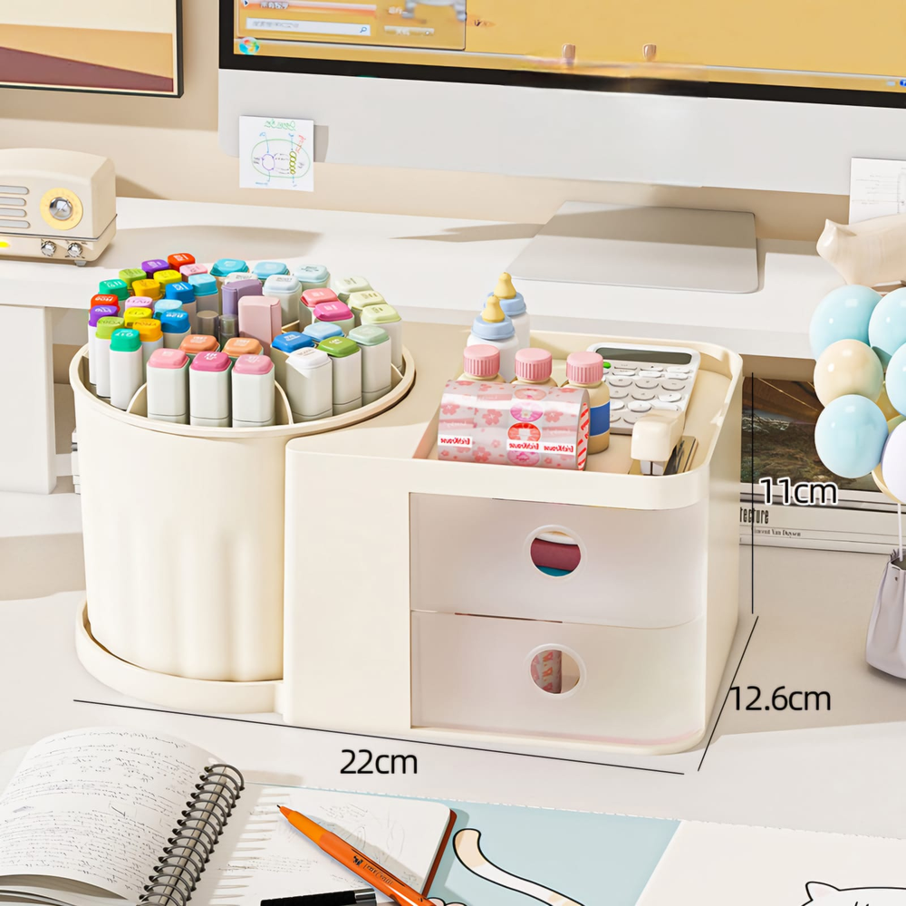 (Organizador de escritorio giratorio con cajones. Sirve para organizar y almacenar suministros de oficina como bolígrafos, lápices, marcadores, clips, tijeras, notas adhesivas, tarjetas de identificación y otros accesorios pequeños, manteniéndolos ordenados y accesibles. Su diseño giratorio permite un fácil acceso a todos los artículos).