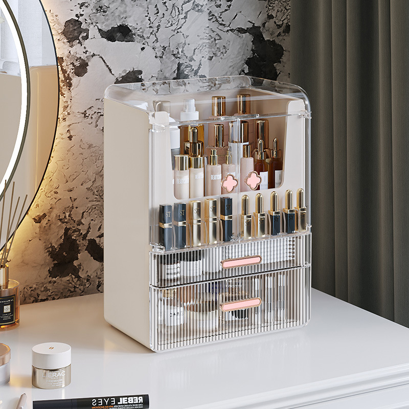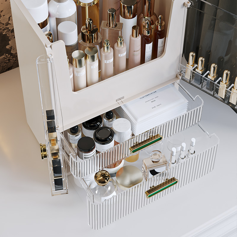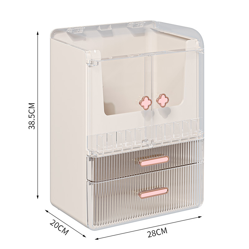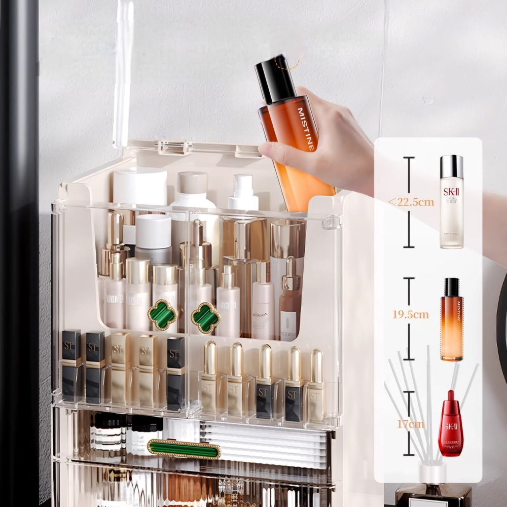 (Organizador que sirve para guardar y organizar diversos productos de belleza y cuidado personal como productos embotellados, labiales, brochas, sérums, mascarillas y perfumes, manteniéndolos ordenados y accesibles. Cuenta con una tapa transparente y cajones que protegen los cosméticos del polvo y la humedad, lo que ayuda a mantenerlos limpios y en buen estado. Combina un diseño moderno y estético con una funcionalidad práctica, ideal para tocadores, baños o cualquier espacio de arreglo personal. La parte de arriba podes abrirla ya que tiene dos puertitas y se puede levantar también la tapa de arriba para guardar frascos. Permite guardar productos hasta 22.5cm de altura).
