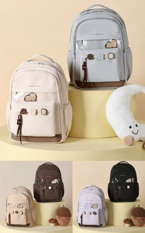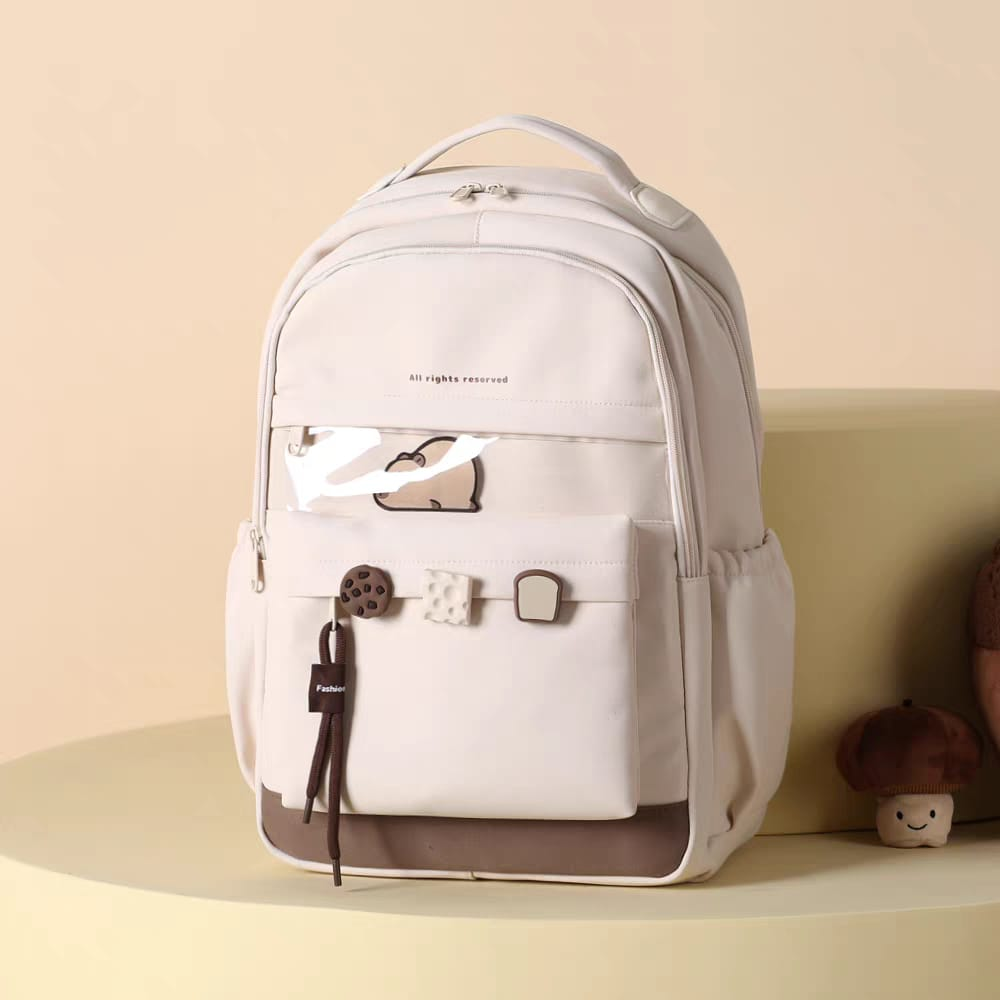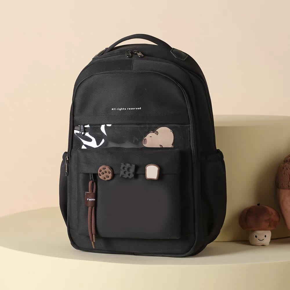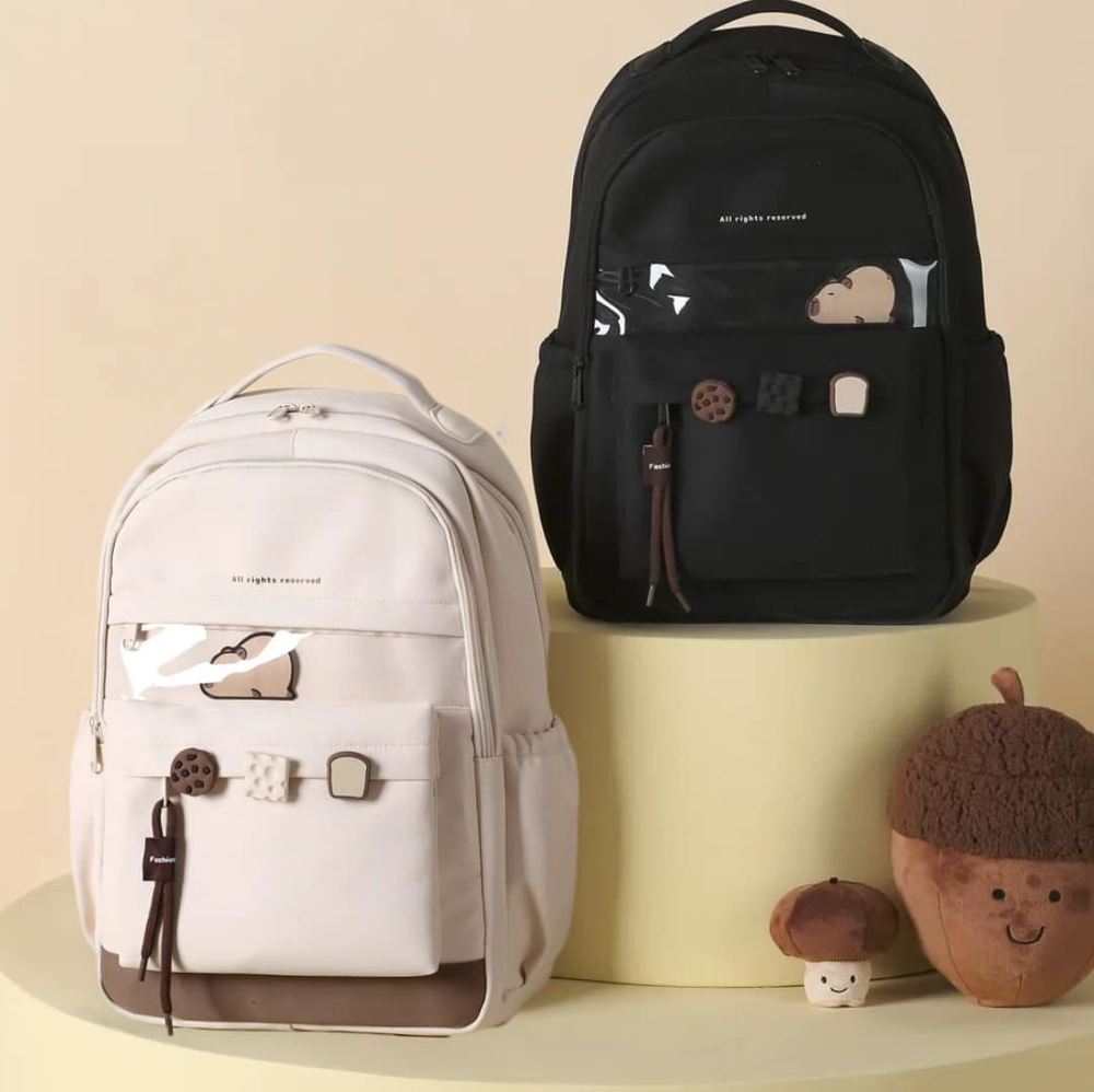 (Mochila Escolar con hermoso diseño de capybara, ideal para llevar todo lo que necesites, ya que es bastante amplia. Dispone de un compartimiento principal con bolsillo interno , 2 compartimientos frontales, 2 bolsillos laterales, tiras acolchadas y un bolsillo trasero.