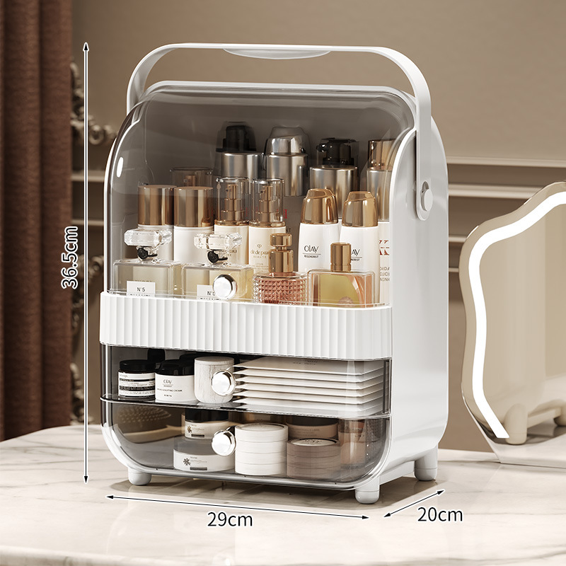 (Organizador de maquillaje portátil que sirve para almacenar y organizar cosméticos y productos de cuidado de la piel, permite mantener labiales, sombras de ojos, brochas, perfumes, cremas y otros artículos de belleza ordenados y fácilmente accesibles. Ayuda a evitar el desorden en tocadores o baños, facilitando la localización de los productos y haciendo la rutina de belleza más eficiente. Almacena los cosméticos de forma organizada, lo que puede contribuir a mantenerlos en mejores condiciones. Al ser portátil, permite trasladar los productos de belleza de un lugar a otro con facilidad).