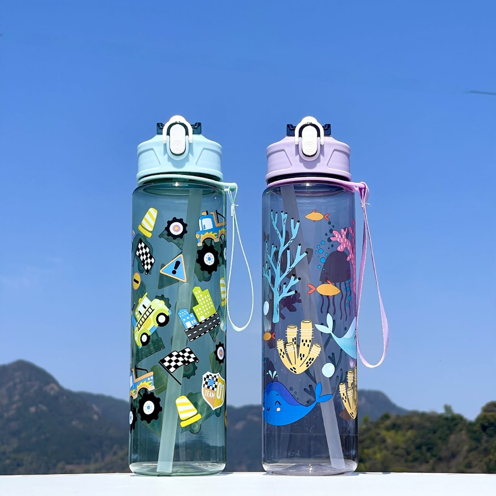 (Botella de agua con dibujos surtidos de estrellas, dinosaurios, etc ,es transparente lo que permite ver el contenido. Ideal para niños o para quienes buscan una botella de agua divertida y con estilo. Cuenta con sorbete y manija ).