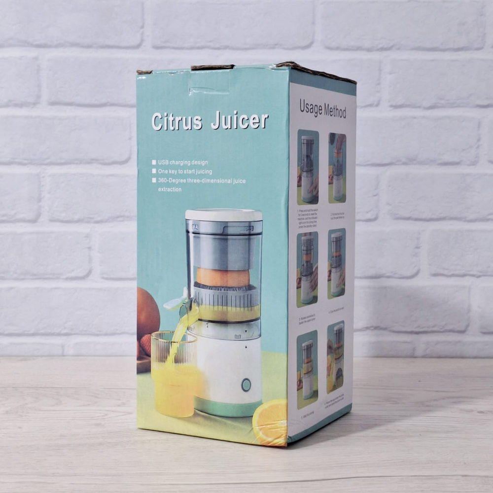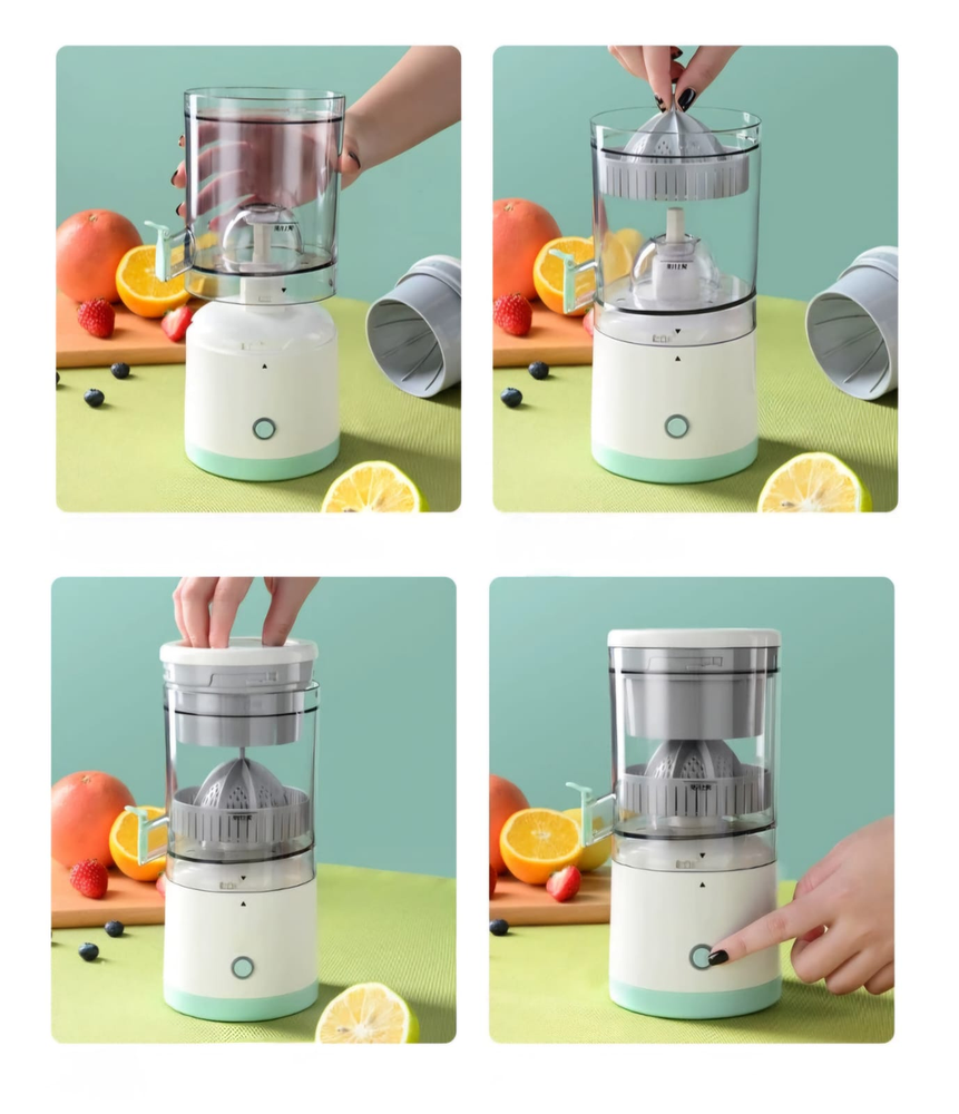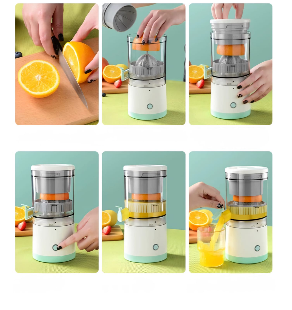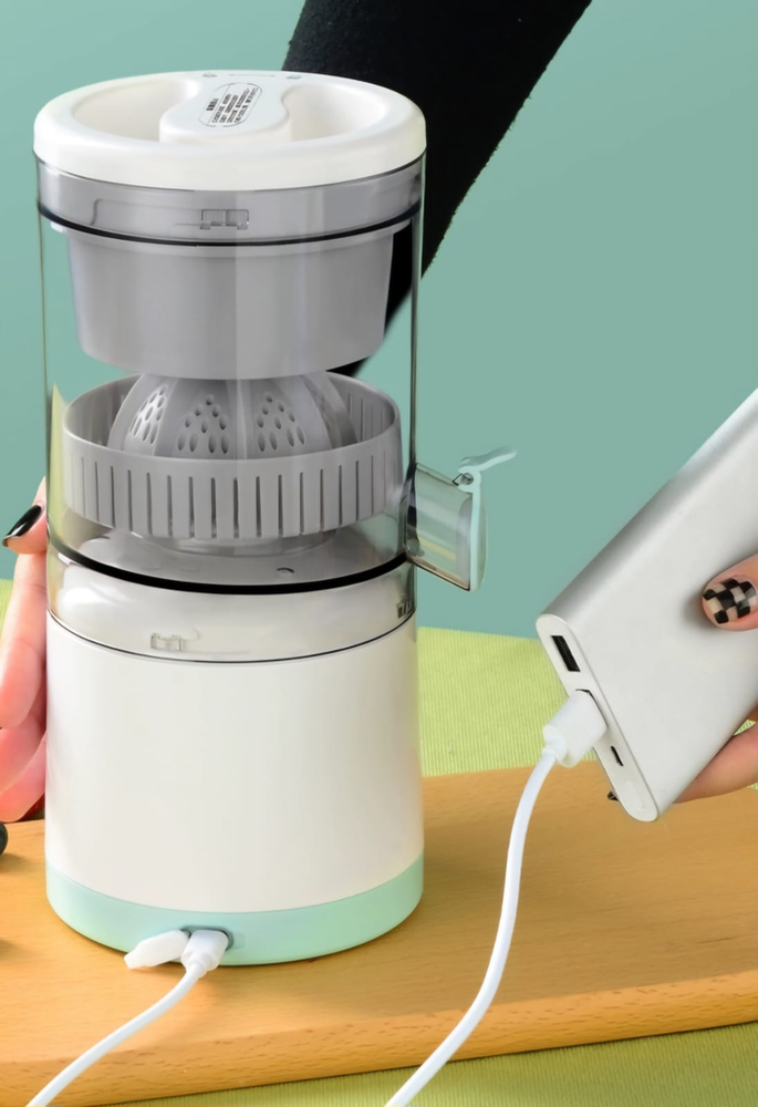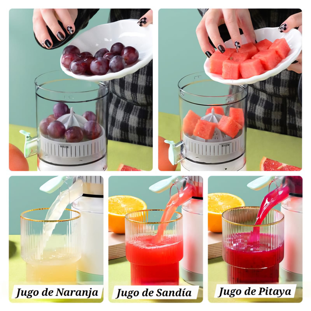 (Exprime el jugo de frutas cítricas como naranjas, limones, kiwis y pomelos, así como otras frutas y verduras, de manera rápida y eficiente. Al ser recargable y portátil, permite preparar jugos frescos en cualquier lugar. Simplifica el proceso de obtención de jugo en comparación con los exprimidores manuales, requiriendo menos esfuerzo. Incluye cable USB).
