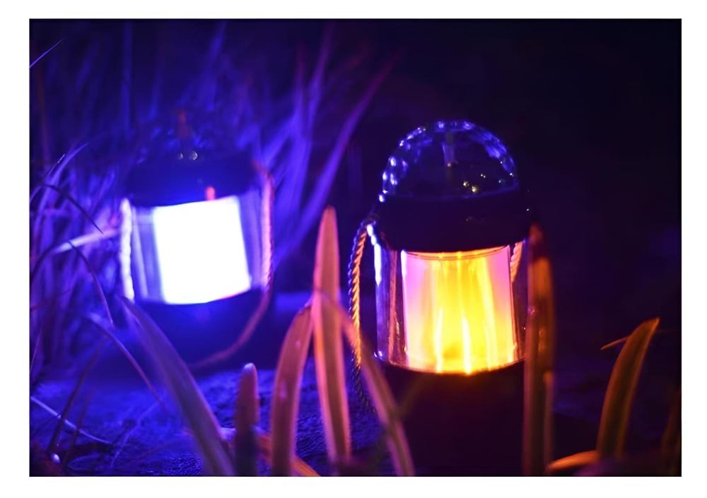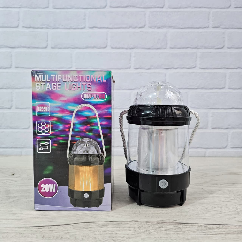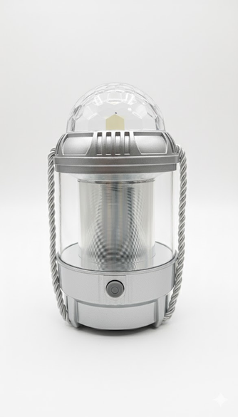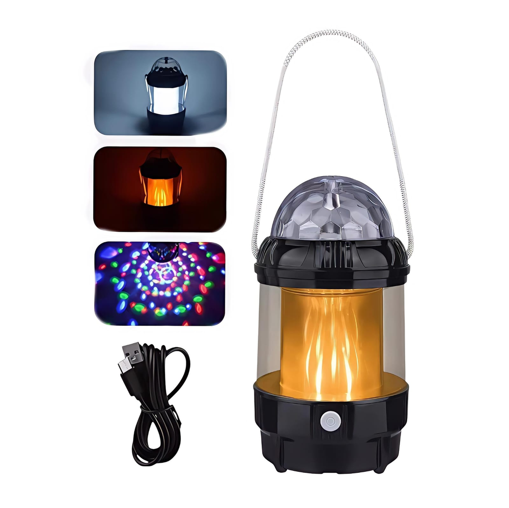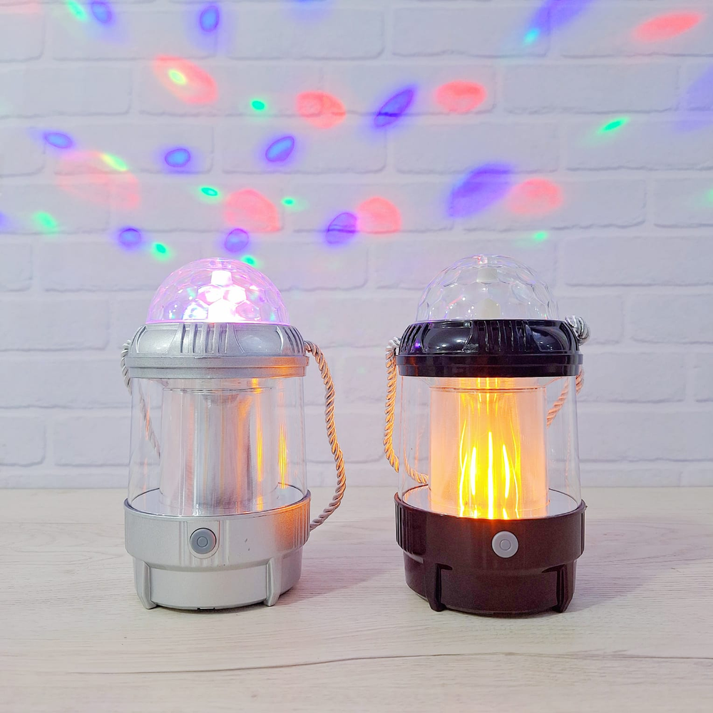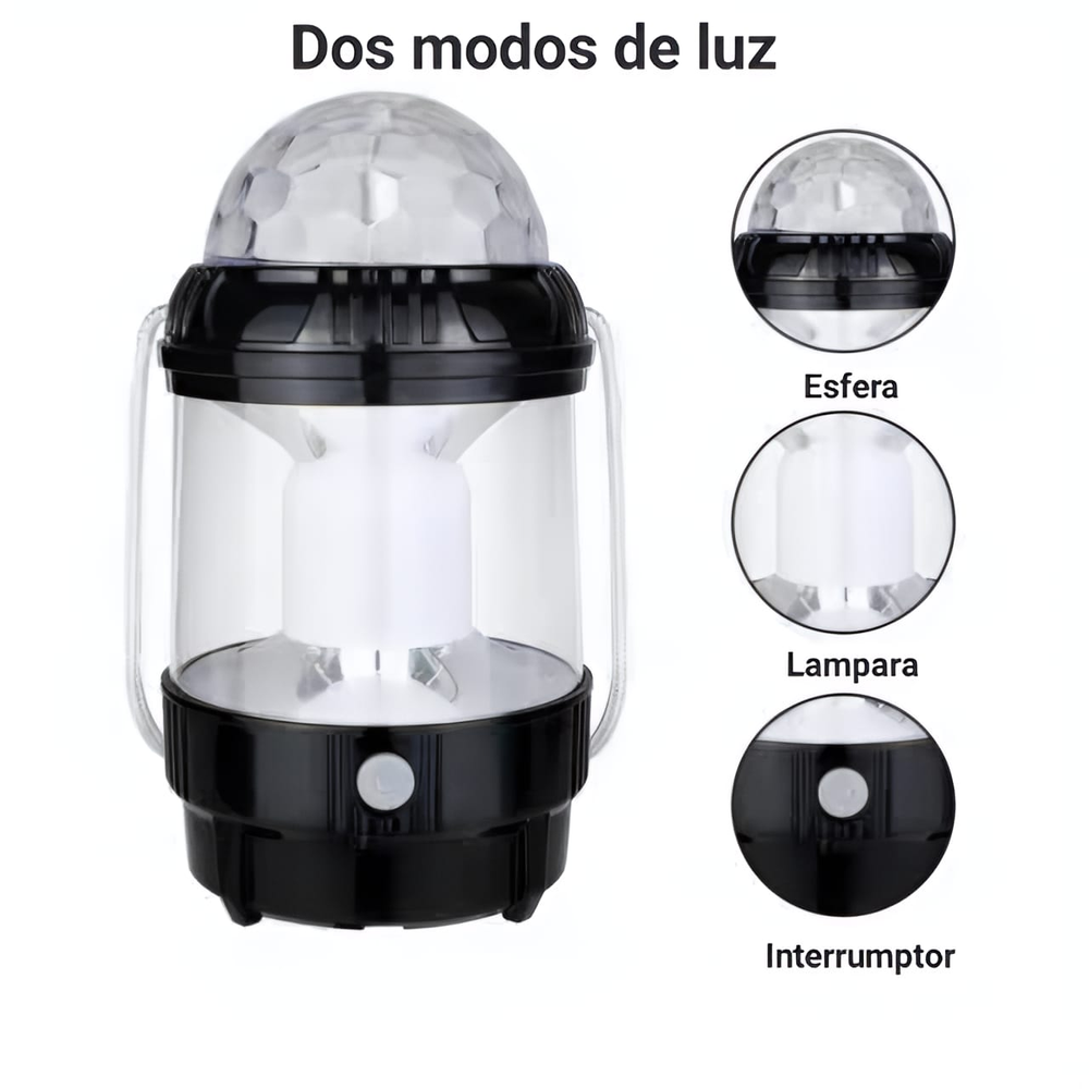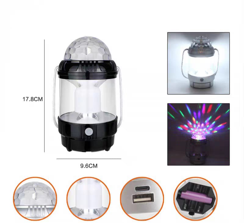 (Linterna LED con una cúpula de bola de discoteca en la parte superior, que proyecta luces de colores. Es un dispositivo compacto y portátil, ideal para llevar a diferentes lugares. Se recarga a través de un puerto USB-C, lo que facilita su conexión a diversas fuentes de energía como bancos de energía, laptops o cargadores. Adecuada para crear ambiente en fiestas, celebraciones, dormitorios, Incluye Batería recargable y cable USB).