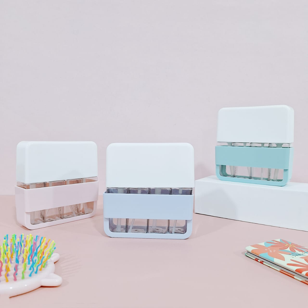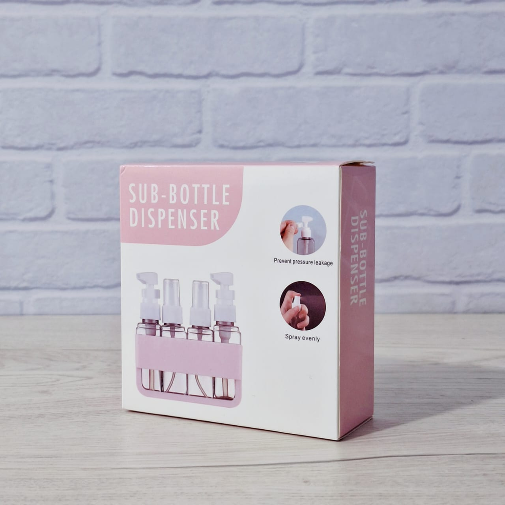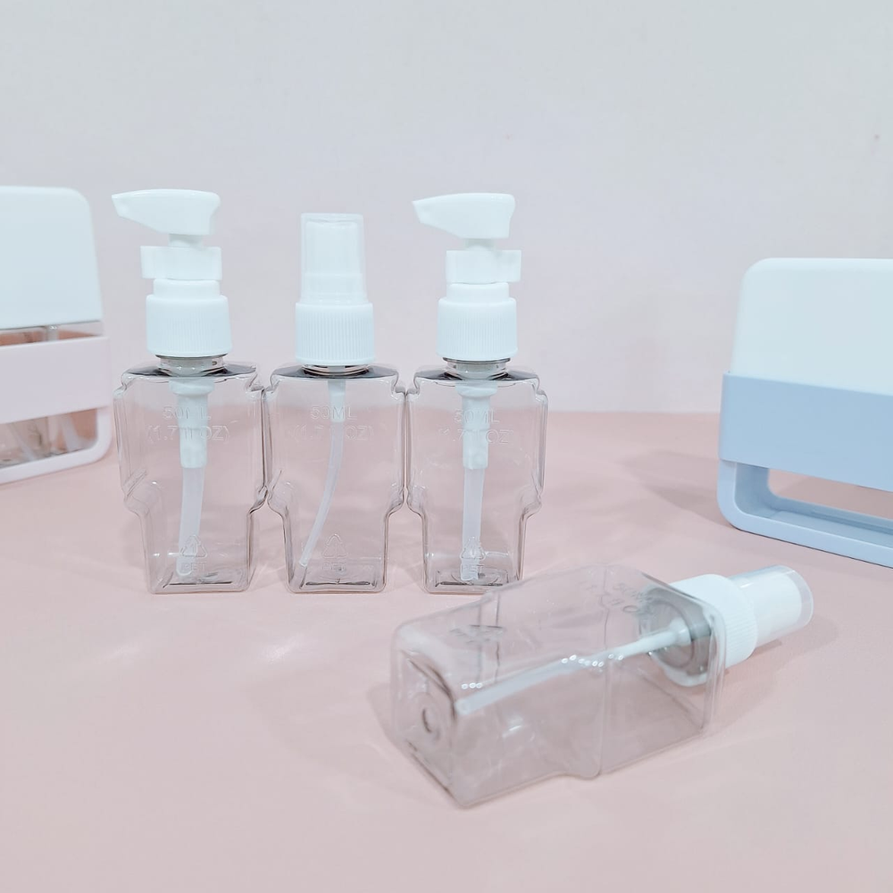(Set de 4 dispenser de higiene personal (botellas con bomba y atomizador), a menudo utilizados para jabón líquido, desinfectante de manos o productos de cuidado personal. Son envases reutilizables, de plástico, con diferentes mecanismos de dispensación como bombas para jabón o atomizadores para líquidos. Ideales para desinfectante de manos, lociones, o productos de limpieza en el hogar, baños públicos o entornos comerciales. Promueven la higiene, controlan el consumo y reducen el desperdicio al dispensar la cantidad necesaria de producto en cada uso).