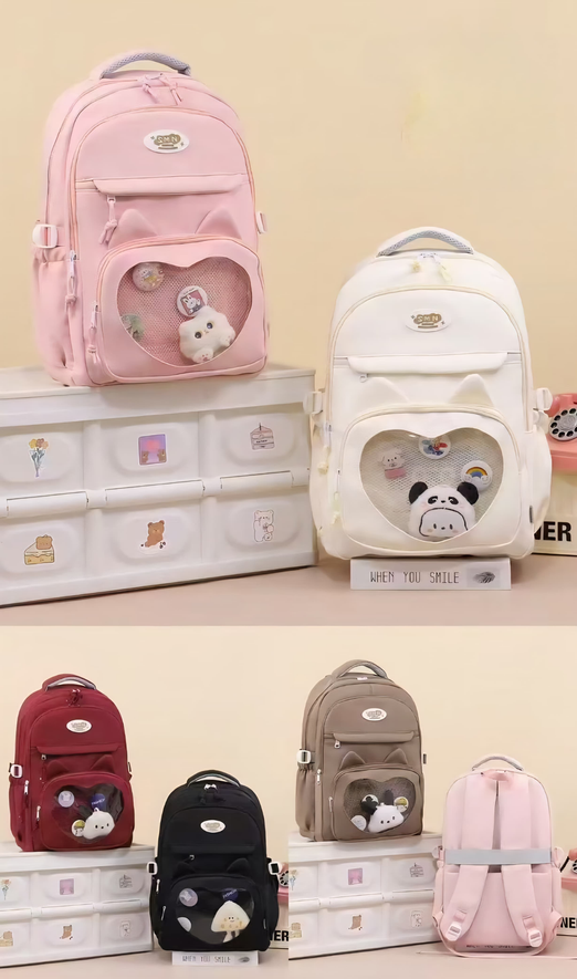 (Mochila escolar o casual, diseñada para llevar libros, útiles escolares, laptops, ropa, botellas de agua y otros objetos personales de forma cómoda y organizada. Dispone de un compartimiento principal , 2 compartimientos frontales, 2 bolsillos laterales, tiras acolchadas y un bolsillo trasero. Trae consigo un llavero peluche de nube con pins surtidos).
