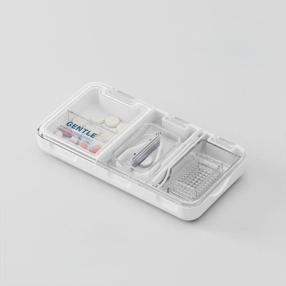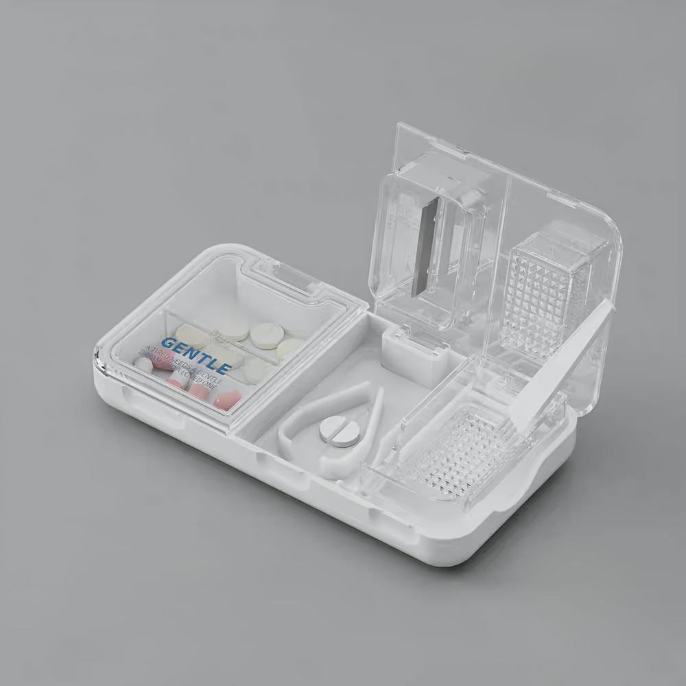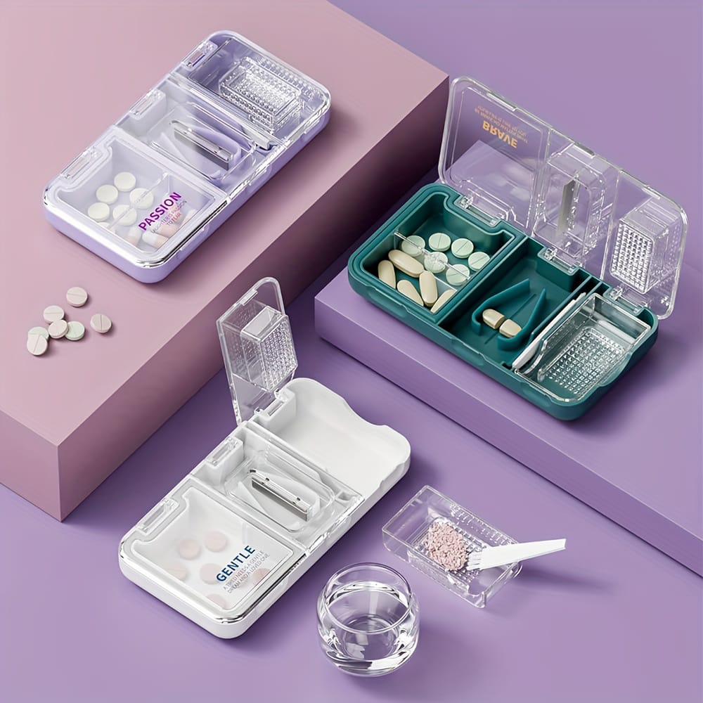 (Dispositivo multifuncional combina las funciones de almacenar, cortar y triturar pastillas. Es ideal para personas que tienen dificultades para tragar pastillas enteras, incluyendo adultos, ancianos, niños y mascotas. El cortador de pastillas tiene una hoja de acero inoxidable duradera y afilada para un corte preciso. Permite dividir las pastillas en mitades, cuartos o incluso octavos, según el modelo. Son portátiles).