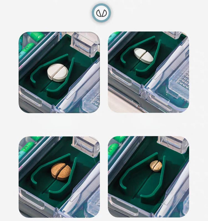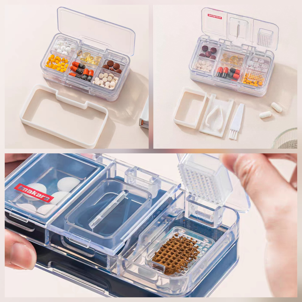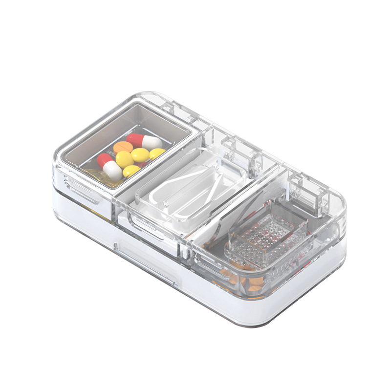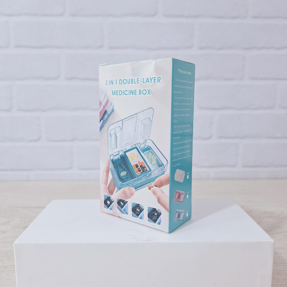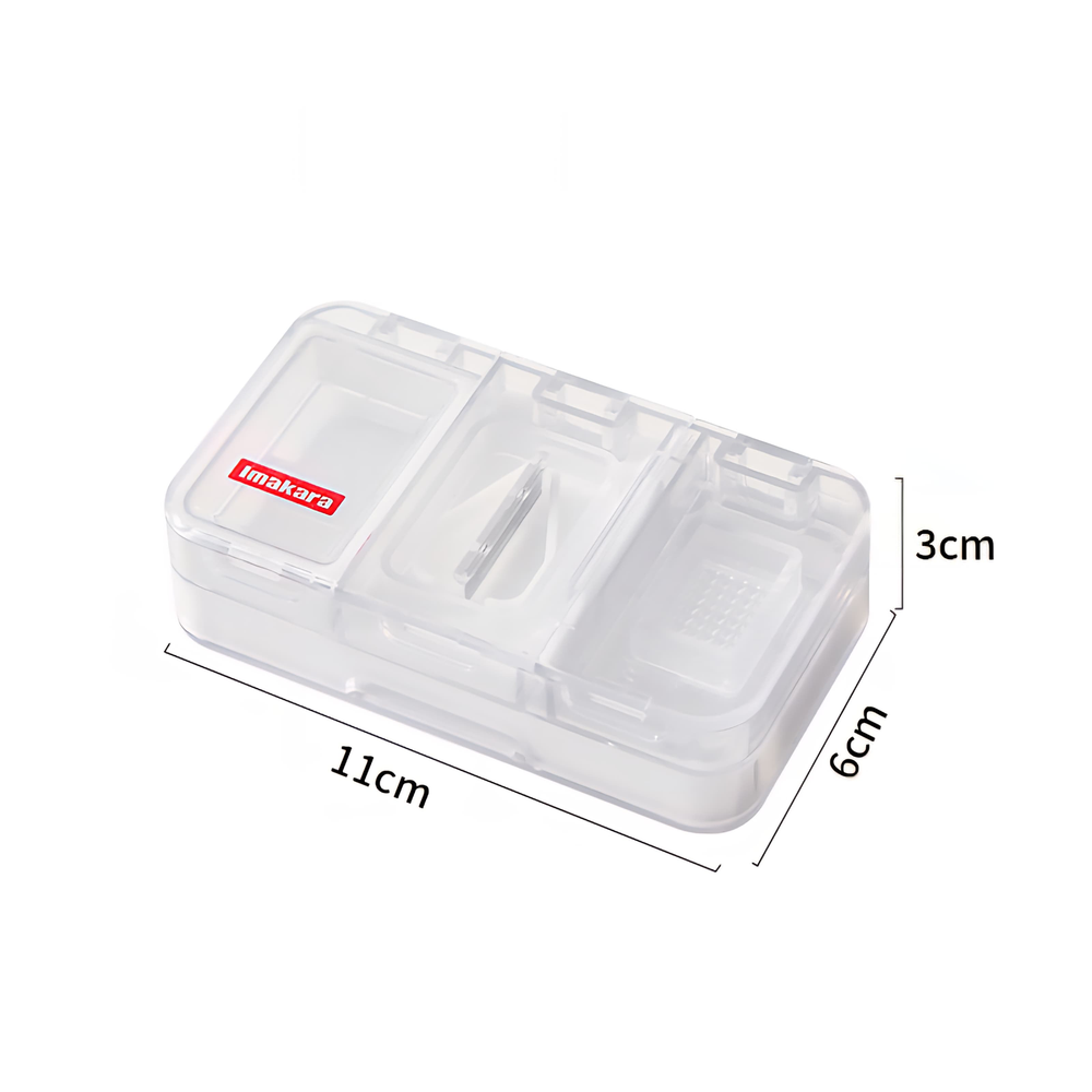 (Pastillero 3 en 1, que combina varias funciones en un solo dispositivo. Incluye un cortador de pastillas para dividirlas con precisión, un triturador para convertirlas en polvo y compartimentos para almacenar pastillas enteras, cortadas o trituradas. Su tamaño compacto lo hace ideal para llevarlo en un bolso, cartera o bolsillo, facilitando el transporte de medicamentos durante viajes o salidas).