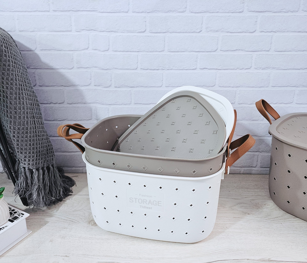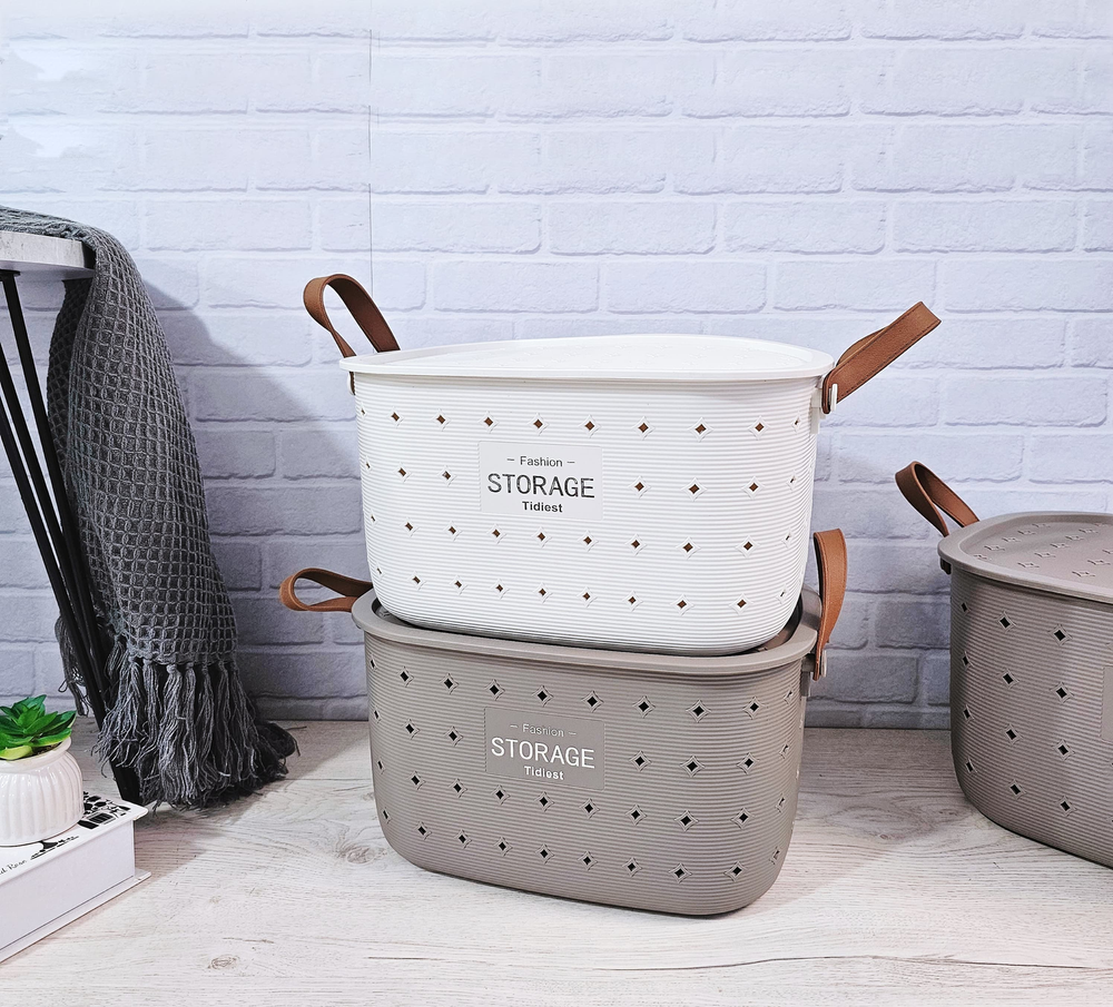 (Canasto organizador de excelente material con tapa, cuenta con asas de goma rígida, ideal para guardar ropa, juguete, etc. Disponible en dos colores).