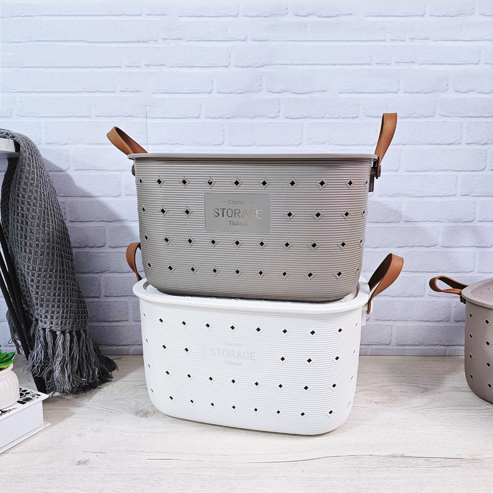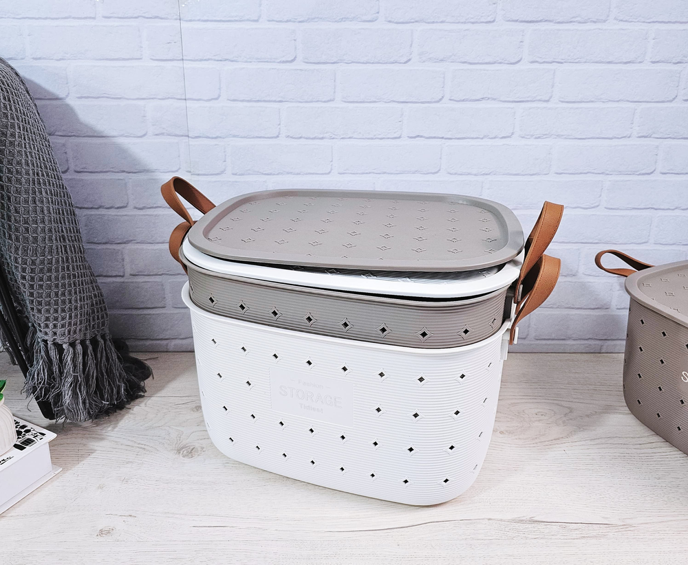 (Canasto organizador con tapa y asas, ideal para guardar ropa, juguete, etc. Disponible en dos colores).