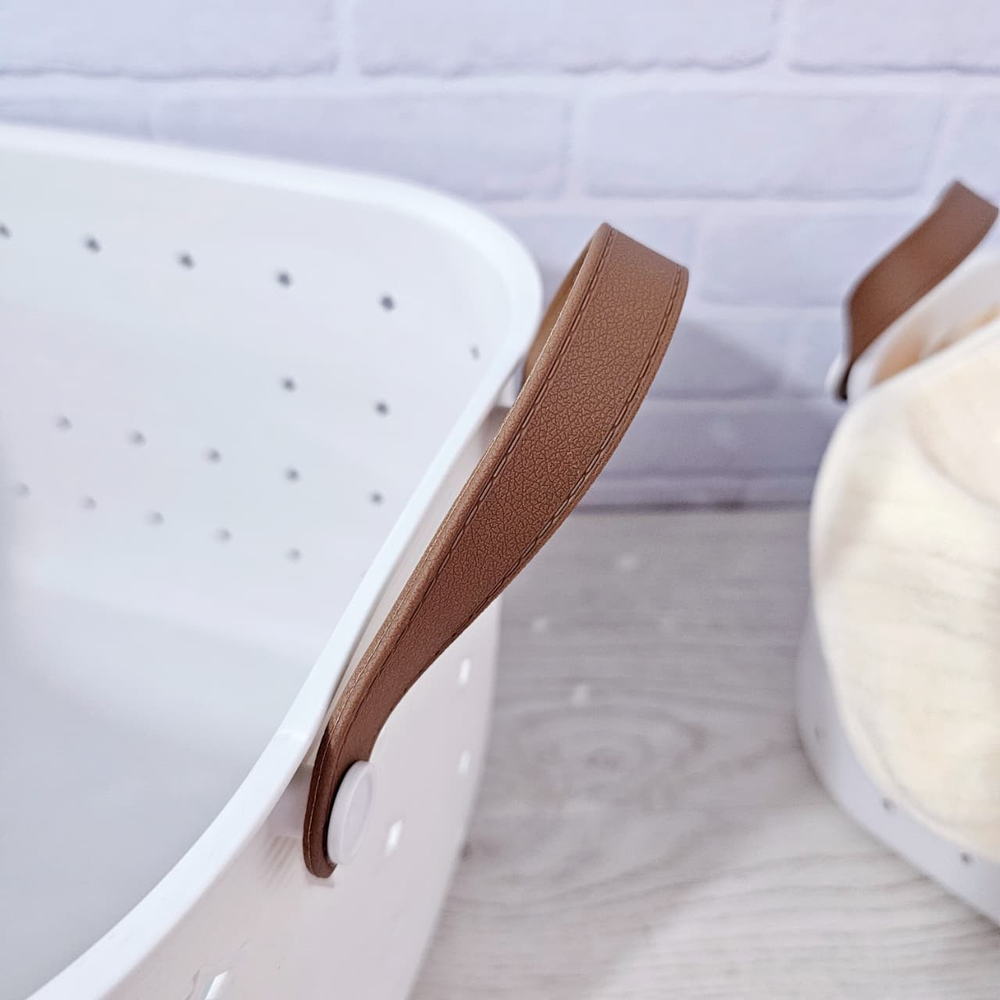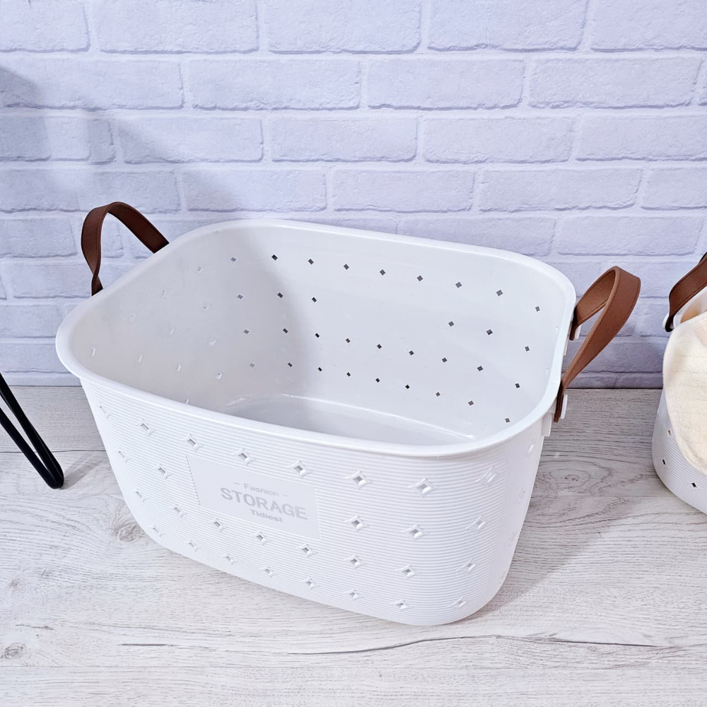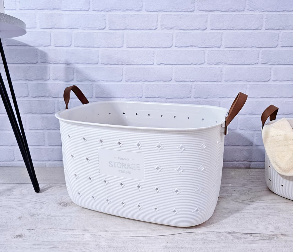 (Canasto organizador con asas, ideal para guardar ropa, juguete, etc. Disponible en color blanco).