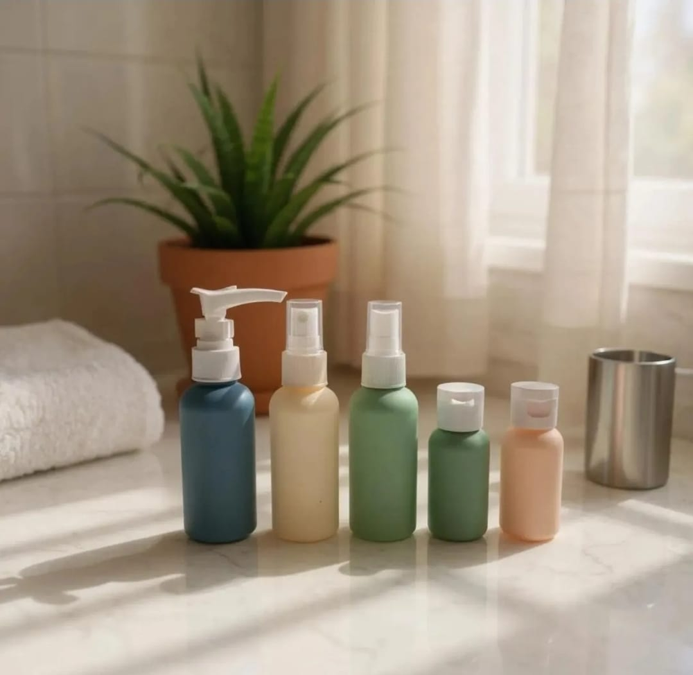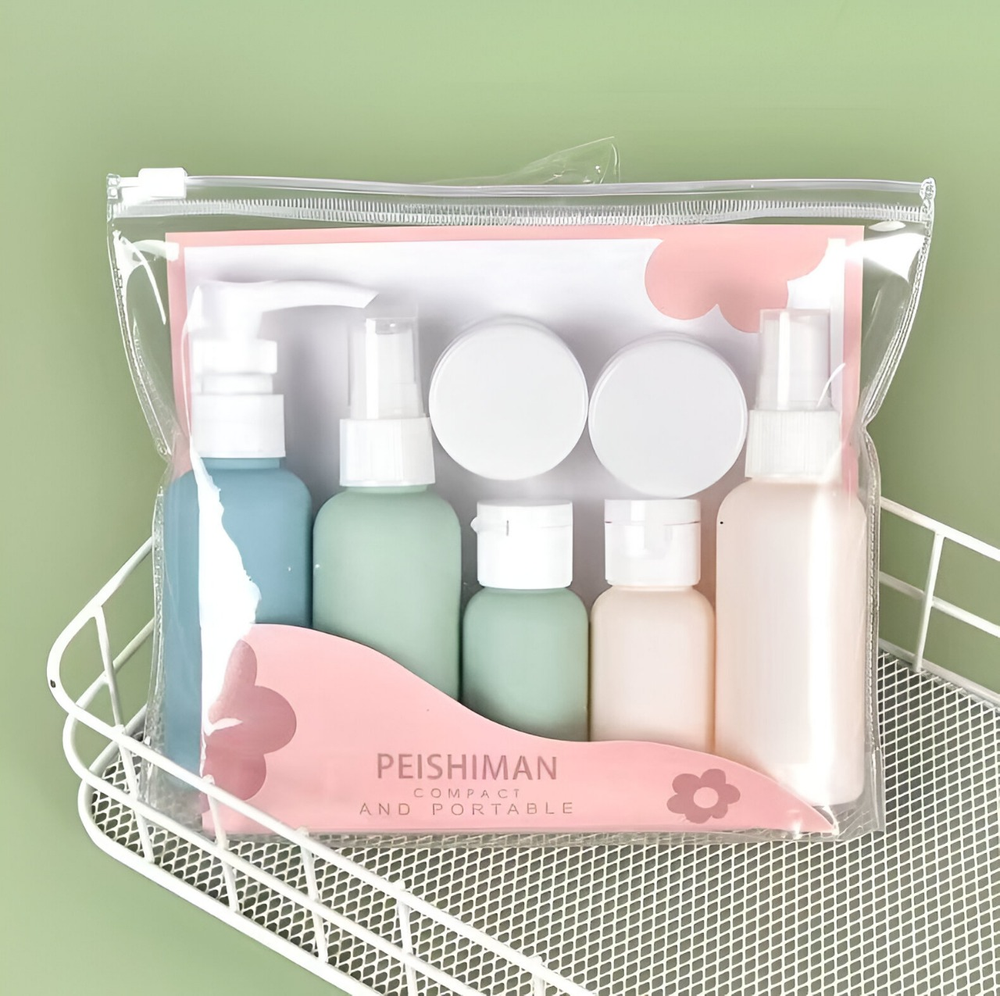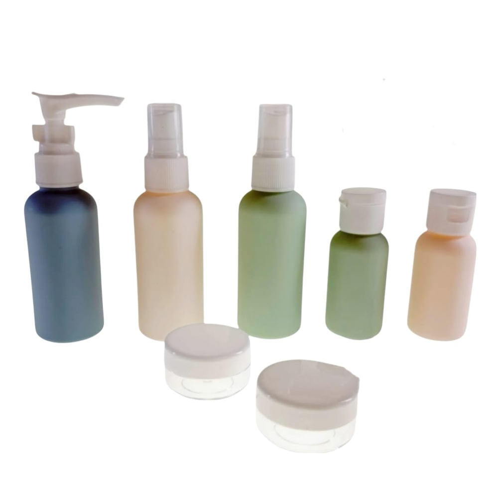 (Set de contenedores compactos y portátiles para viaje, ideal para transportar productos de higiene personal. Es un set de contenedores de plástico resistentes y reutilizables, diseñados para almacenar y transportar productos de higiene personal o cosméticos durante los viajes. Incluye frascos con dosificador, frasco con spray, frasco con tapa de rosca y pequeños tarritos para cremas o geles. Su diseño compacto y ligero los hace ideales para ahorrar espacio y facilitar el transporte).