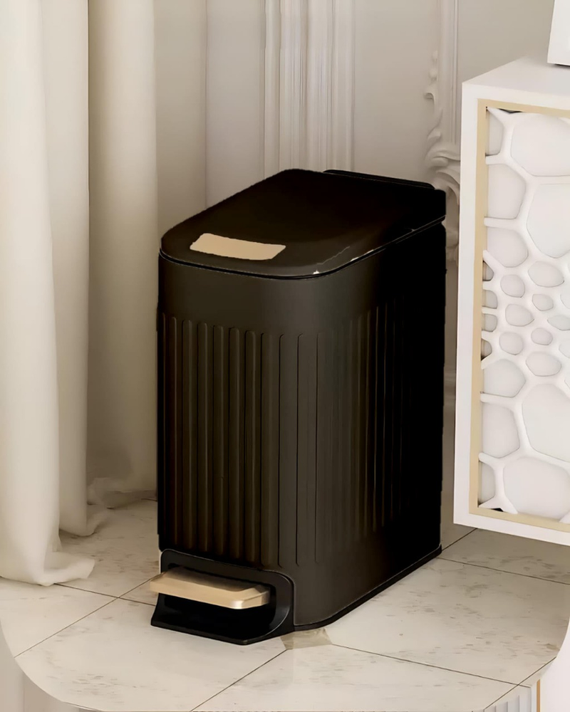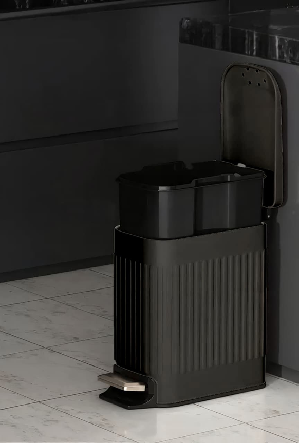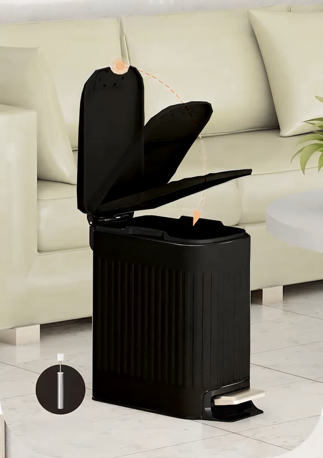 (Es un cesto de basura con una capacidad de 6 litros. Cuenta con un pedal para abrir la tapa, lo que facilita la eliminación de residuos. La tapa tiene un sistema de apertura silenciosa. Está diseñado para una fácil eliminación de basura).
