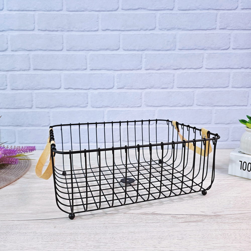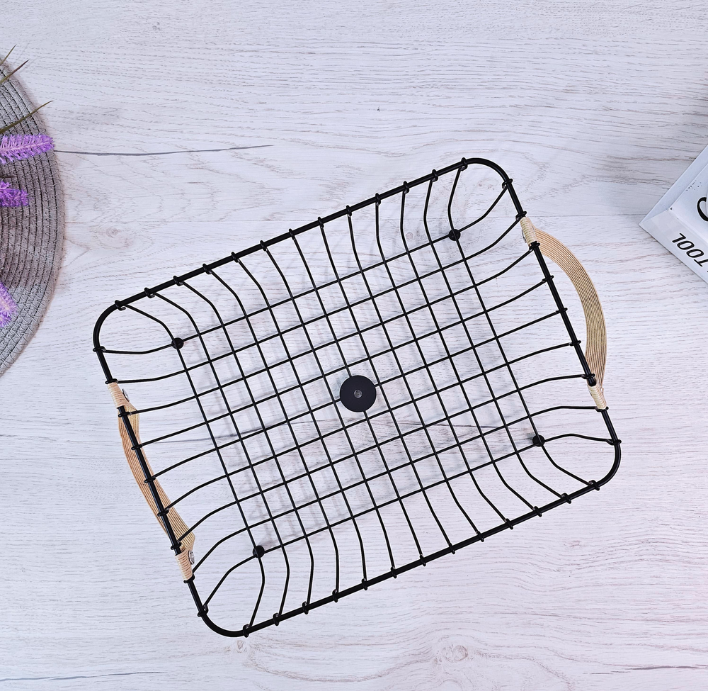 (Cesta o frutero de metal negro con asas que se puede utilizar para almacenar y exhibir frutas y verduras. Ayuda a mantener la cocina o la despensa organizadas. Sirve como un elemento decorativo en la mesa del comedor añadiendo un toque natural y estético. El diseño permite la circulación del aire, lo que ayuda a mantener las frutas y verduras frescas por más tiempo y reduce la acumulación de polvo).