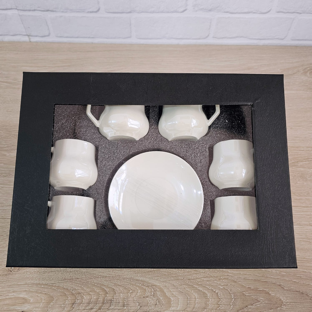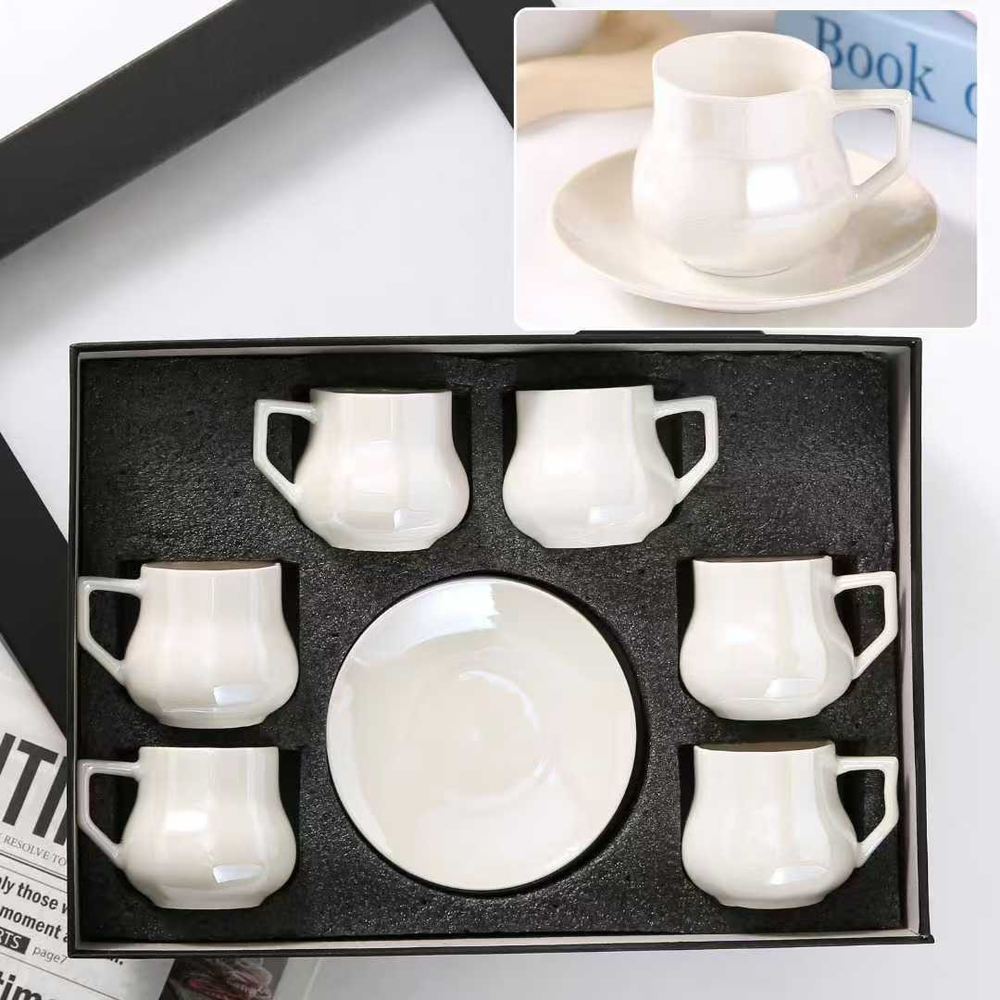 (Con un diseño minimalista de 6 tazas y 6 platos . Su forma y su color blanco le aportan elegancia, lo que lo hace perfecto para regalos, es versátil para té, café o leche).