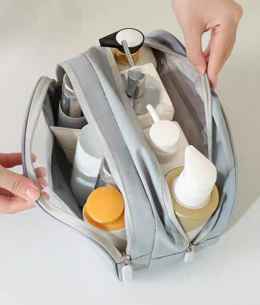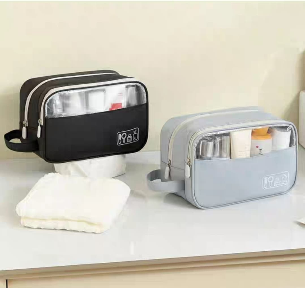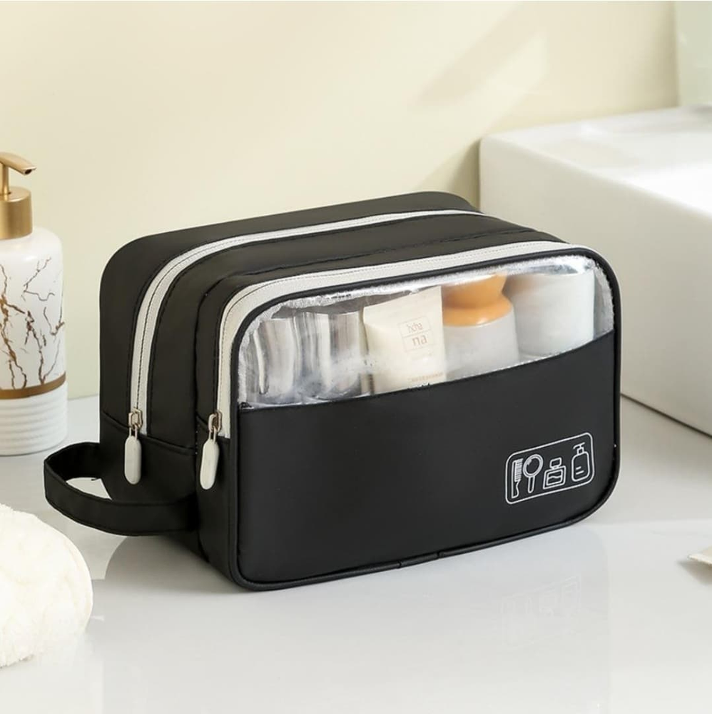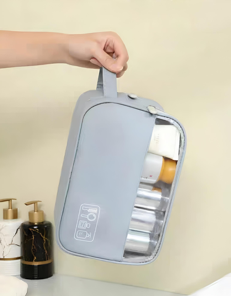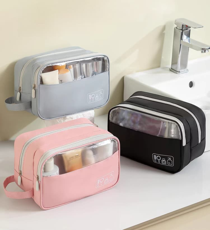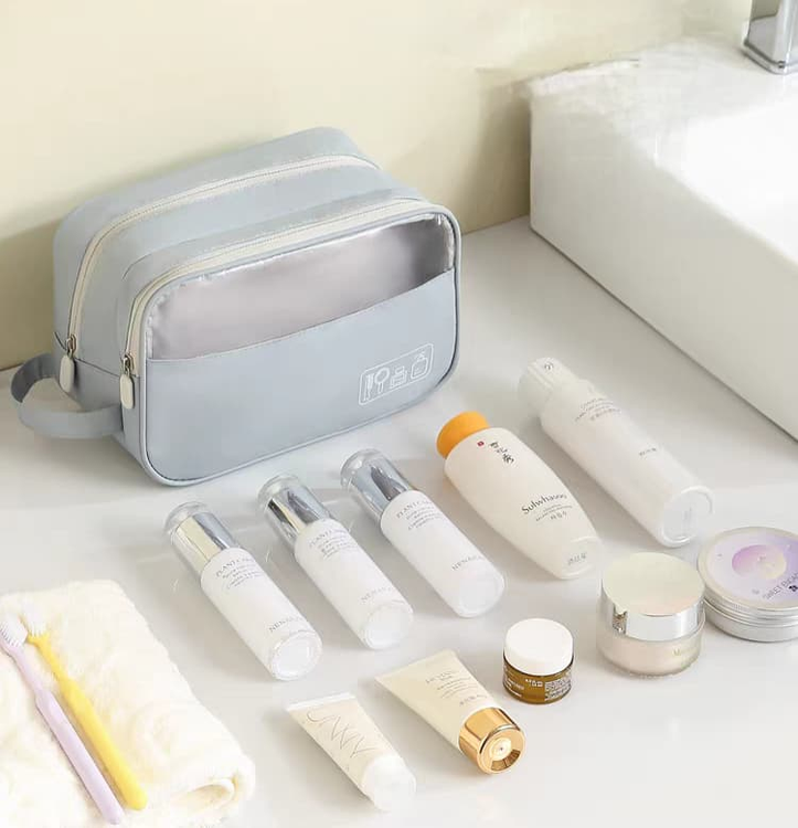 (Portacosméticos para organizar y transportar productos de belleza y cuidado personal como maquillaje, cremas, y artículos de tocador. Mantiene los productos protegidos de derrames y la humedad, gracias a su material impermeable. Facilita la visualización del contenido debido a su diseño semitransparente).