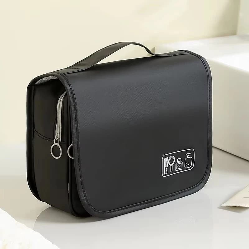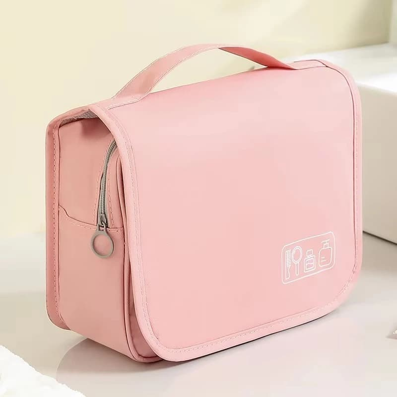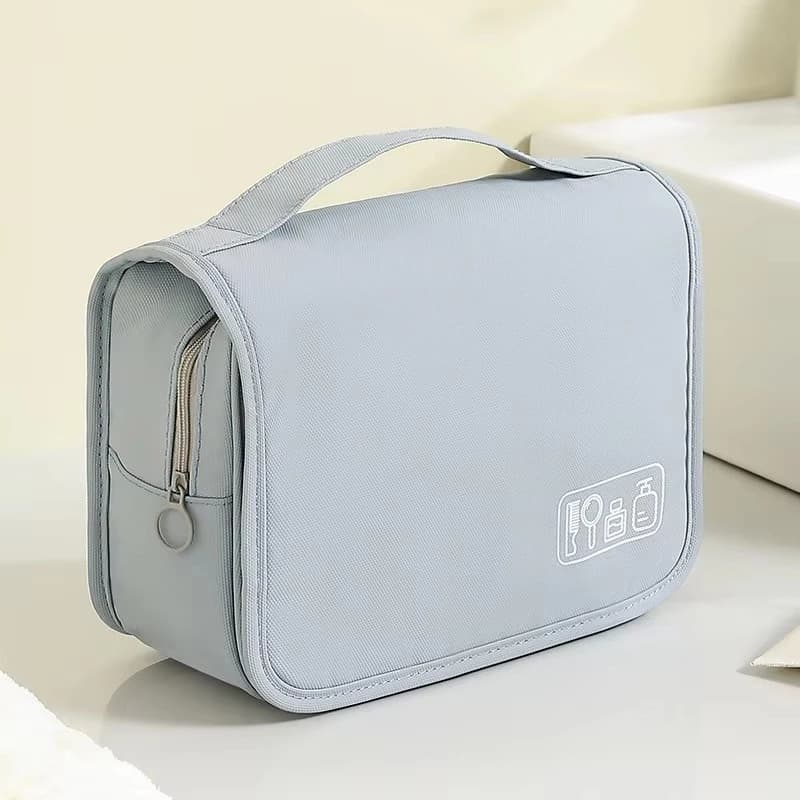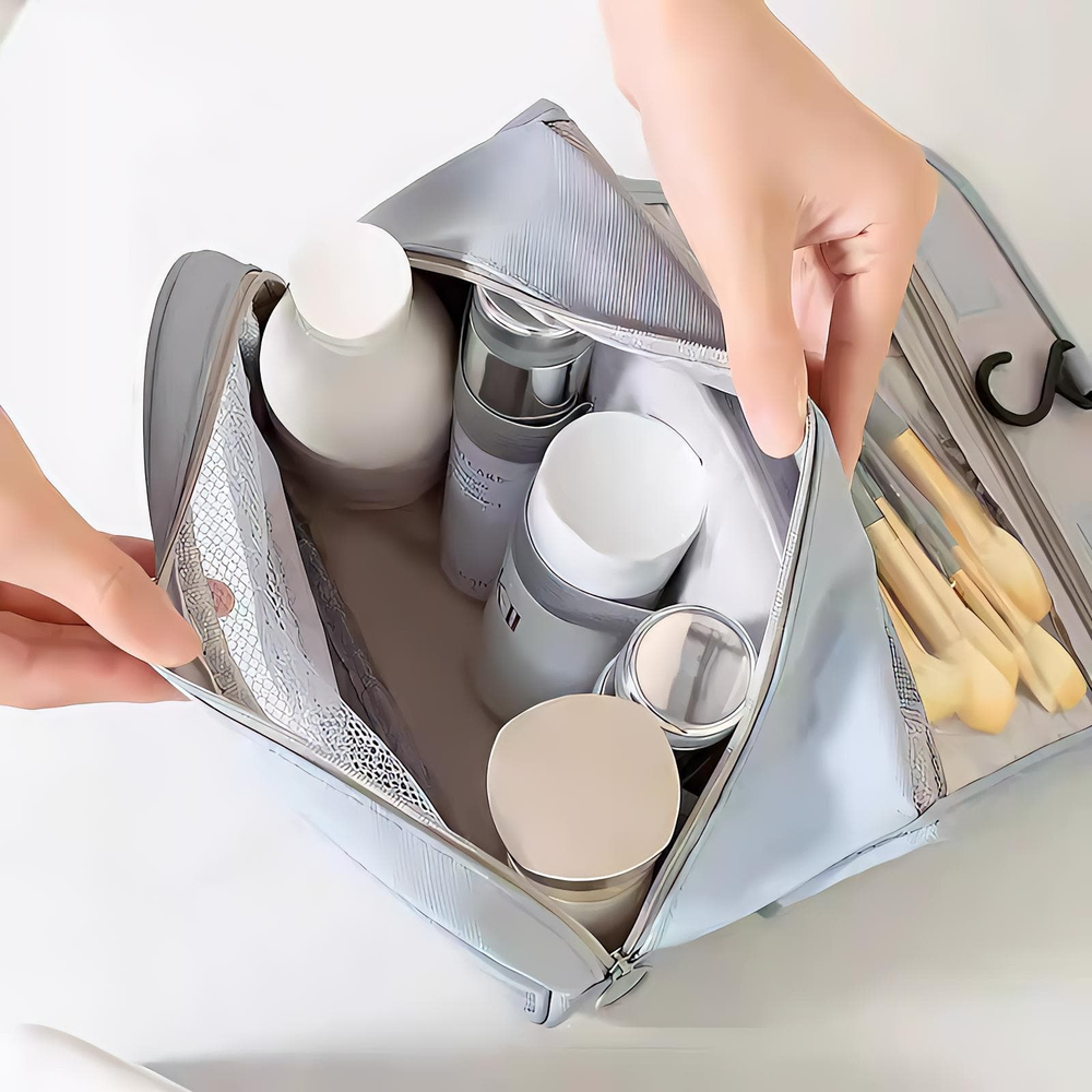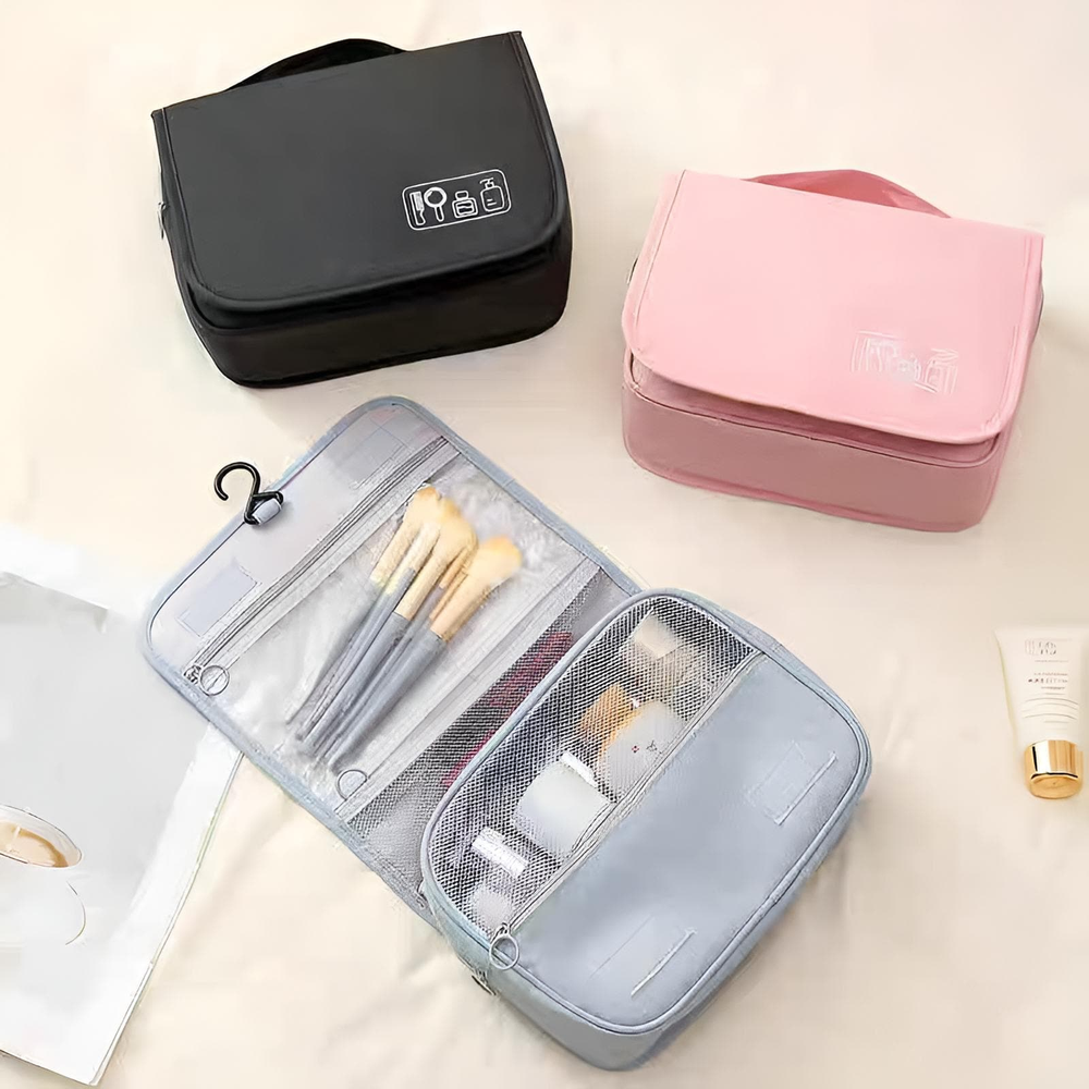 (Neceser plegable con compartimentos de malla y un gancho para colgar, ideal para viajes y optimizar el espacio en el baño y también es portátil con asa de mano, perfecto para llevar cosméticos o artículos de cuidado personal de forma organizada. Están diseñados para mantener los artículos de higiene y belleza ordenados y protegidos, especialmente durante viajes).