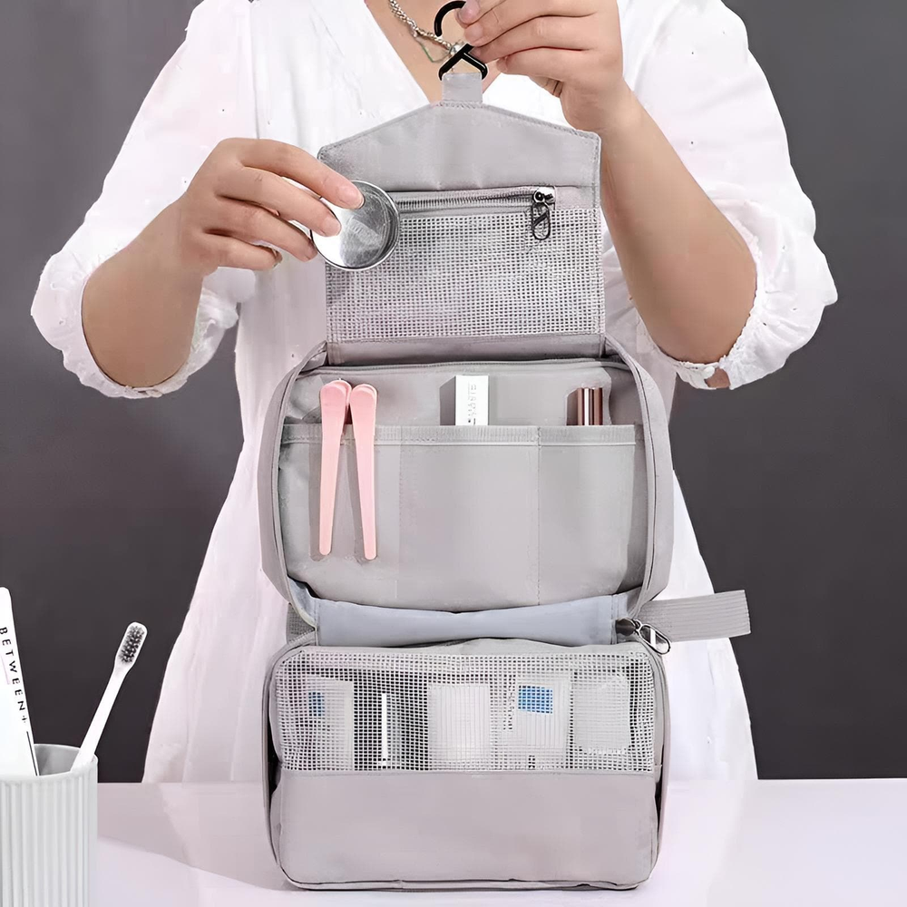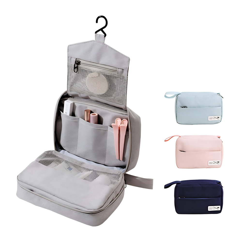 (Neceser organizador de viaje con gancho, ideal para guardar cosméticos y artículos de tocador. Permite organizar eficientemente productos de cuidado personal, maquillaje y artículos de aseo gracias a sus compartimentos internos y bolsillos de malla. Incluye un gancho para colgarlo fácilmente en baños o armarios, facilitando el acceso a los artículos y manteniendo el espacio ordenado, ideal para viajes o baños pequeños. Fabricado en materiales resistentes, con costuras y cremalleras de calidad para asegurar durabilidad. Es adecuado tanto para hombres como para mujeres, y es útil para viajes, vacaciones, paseos o incluso para organizar artículos en casa).