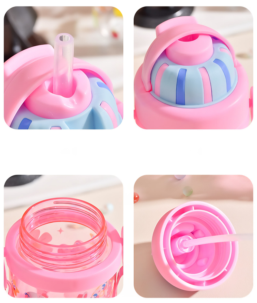(Botella animada para niños, niñas y adultos. Son cómodas y fáciles de transportar. Cuenta con tapa a rosca, pico de succión y una correa).