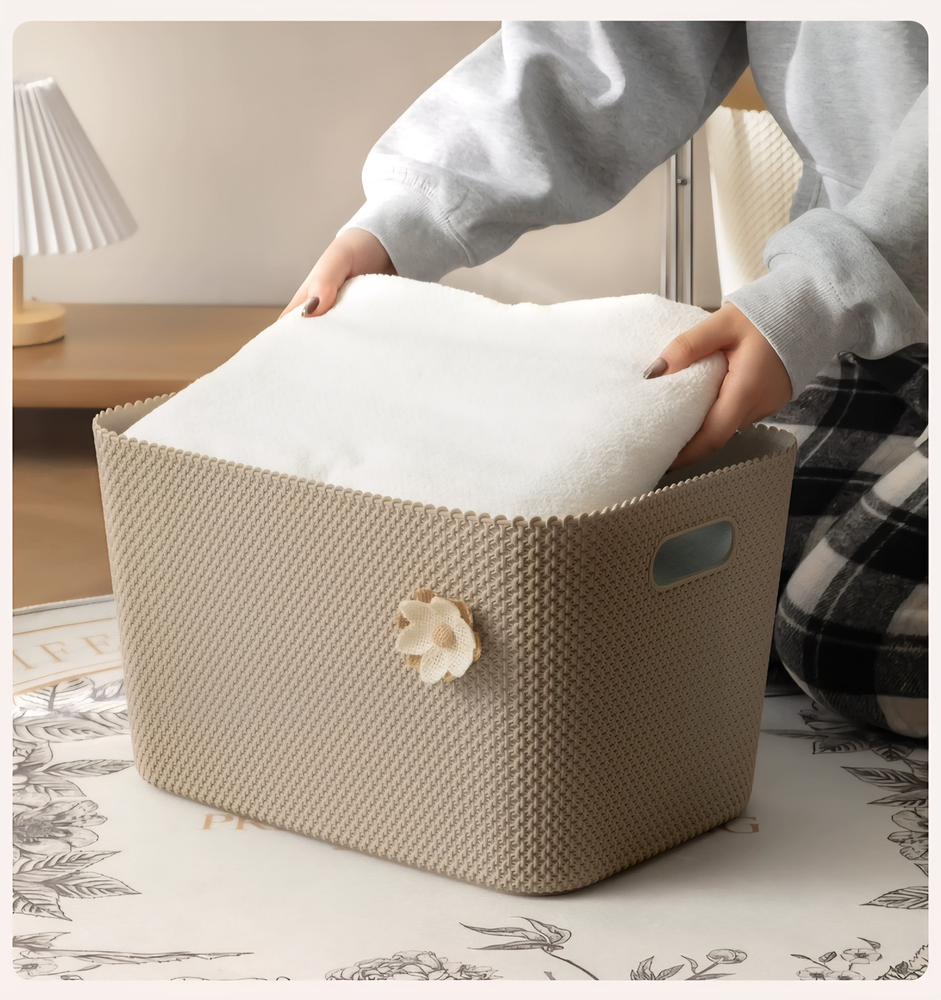 (Canasta de almacenamiento, específicamente una cesta de almacenamiento estilo ratán. Sirve para organizar, almacenar y optimizar espacios en diferentes áreas del hogar como habitaciones, baños, estudios, armarios, lavanderías, etc). ut24