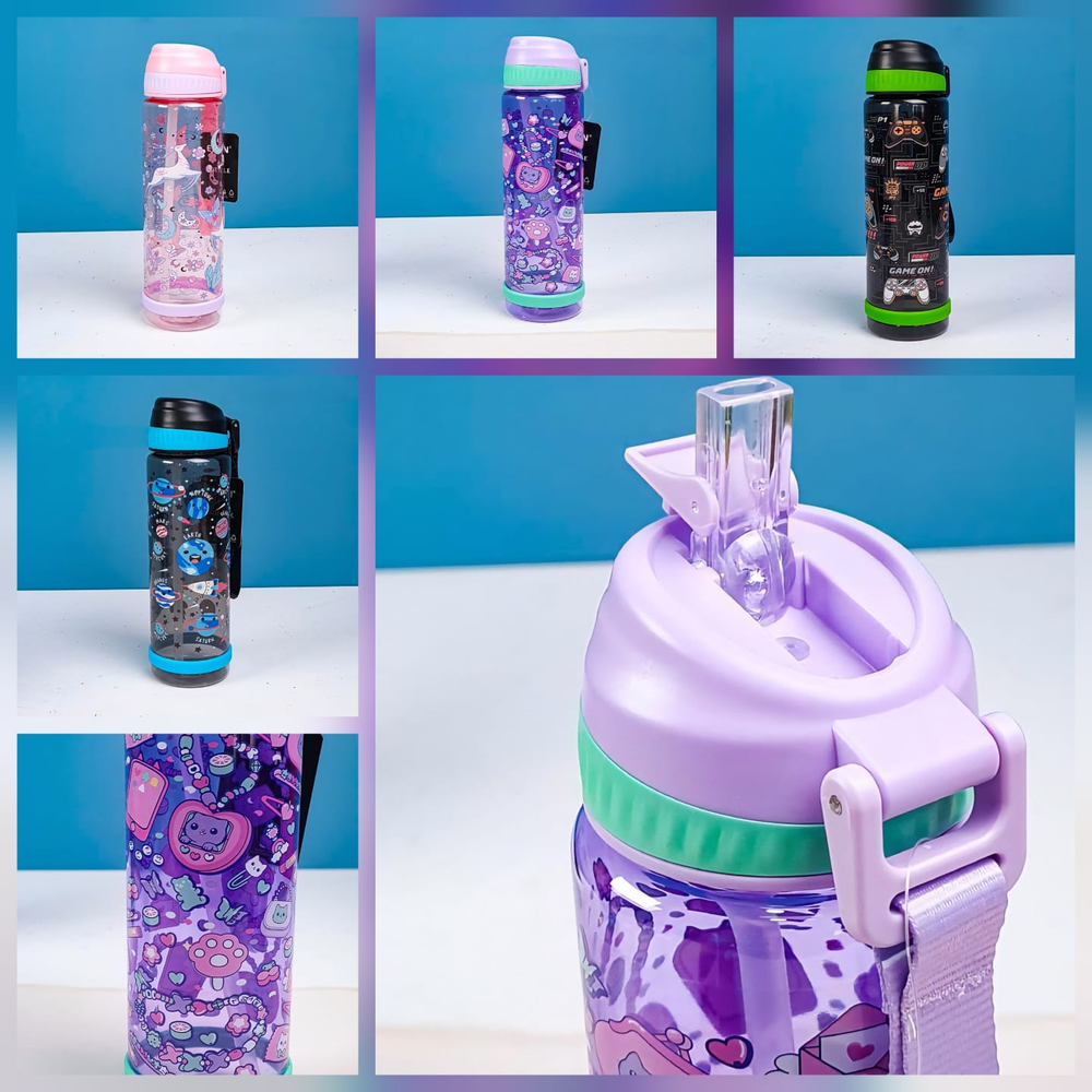 (Botella animada para niños, niñas y adultos, tiene capacidad de 750ml. Son cómodas y fáciles de transportar. Cuentan con pico rebatible, tapa a rosca y un correa).