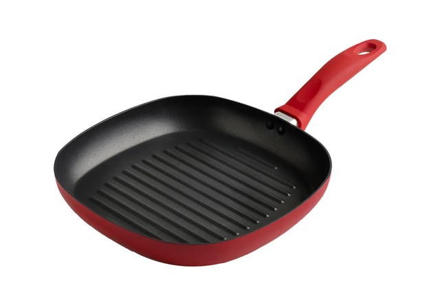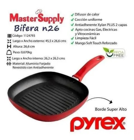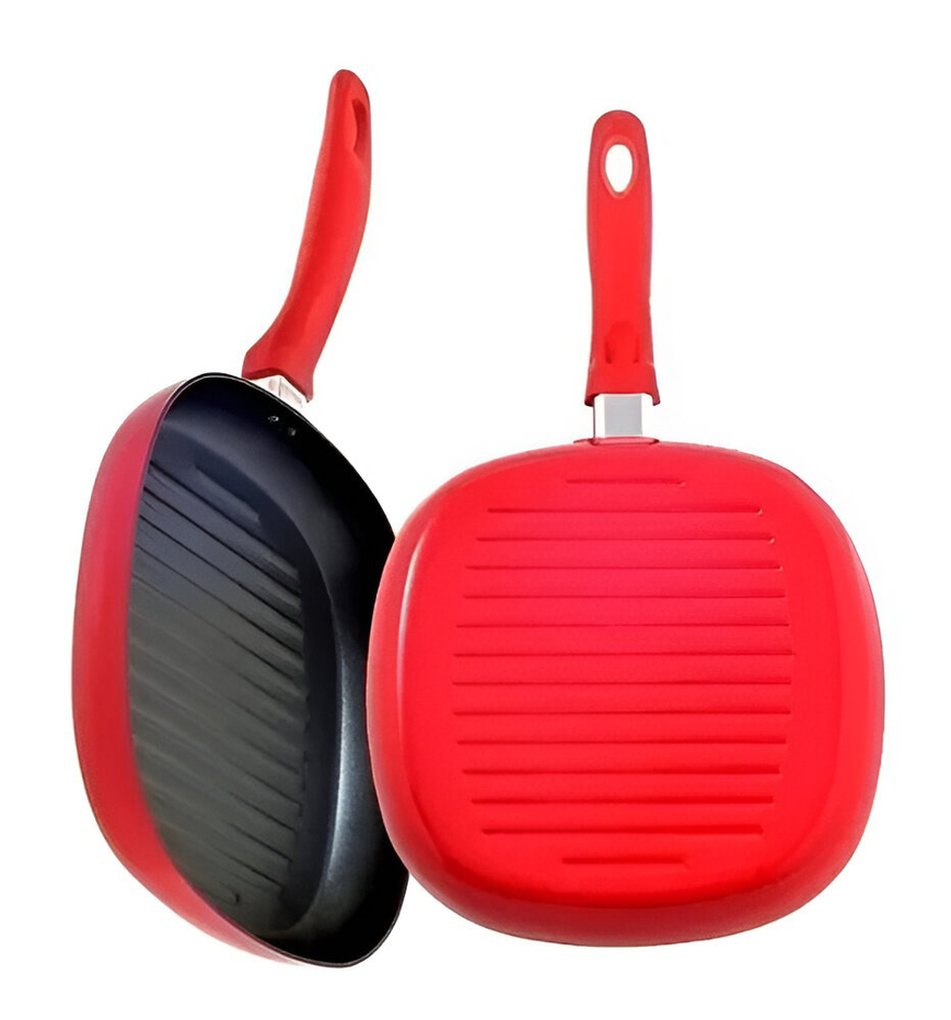 (Sartén con superficie acanalada, ideal para asar carnes, vegetales y otros alimentos, dejando marcas de parrilla. Cuenta con un revestimiento antiadherente de teflón, lo que facilita la cocción sin que los alimentos se peguen y simplifica la limpieza. Su tamaño de 26 cm la hace adecuada para preparar porciones individuales o para dos personas. El mango es de color rojo, a juego con el exterior de la sartén, y está diseñado para un agarre cómodo).