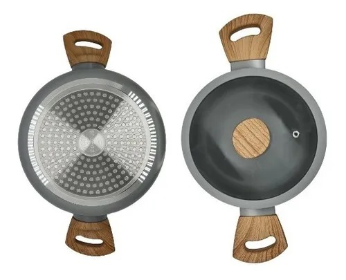 (Cacerola con revestimiento antiadherente, ideal para cocinar con menos grasa y facilitar la limpieza. Presenta un estilo nórdico o "Scandi" con asas y pomo de la tapa imitación madera, lo que le da un toque estético. Incluye una tapa de vidrio templado que permite ver el contenido mientras se cocina).