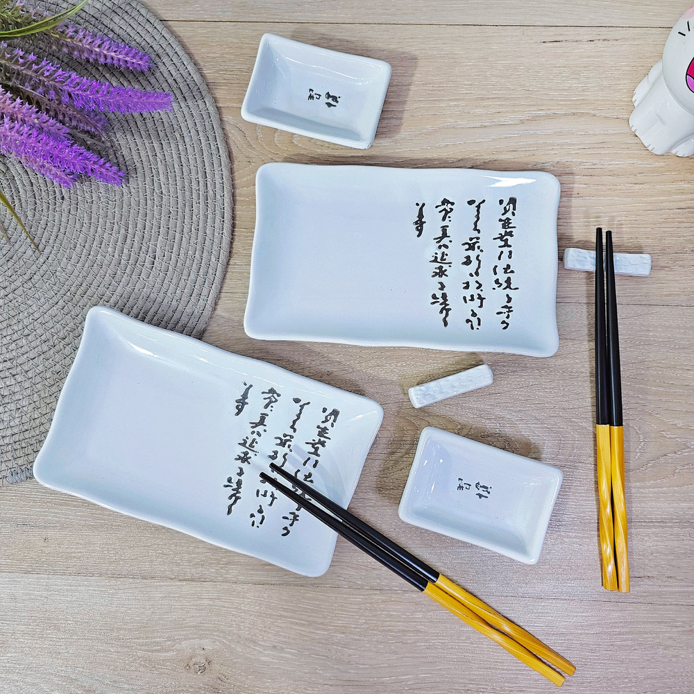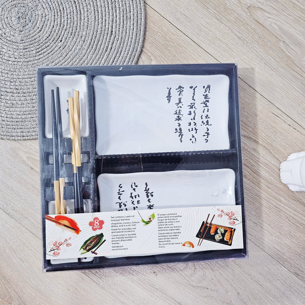 (set de sushi 6 piezas , este esta compuesto por 2 pares de palillos de madera y 2 cuencos. Ideal para tus comidas, postres, etc, o para regalar ya que su empaque es muy elegante).