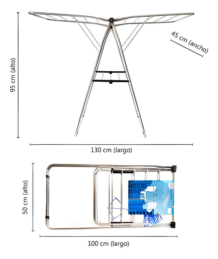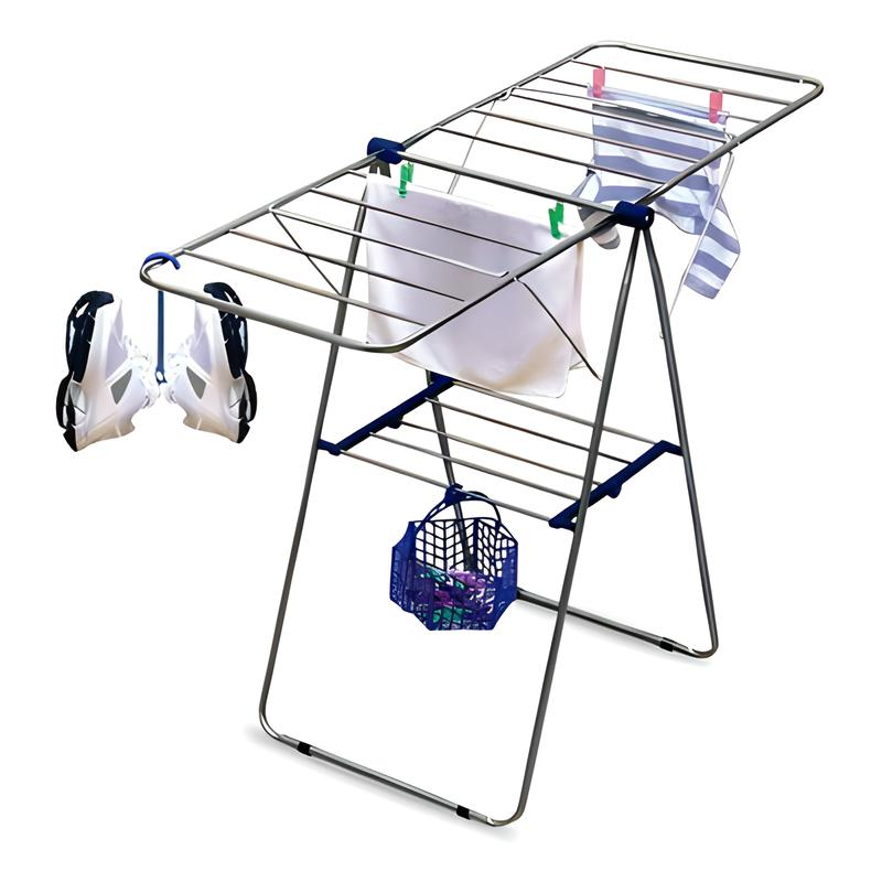 (Su diseño permite plegarlo fácilmente para guardarlo y ahorrar espacio cuando no se utiliza, siendo ideal para espacios reducidos. Fabricado en acero inoxidable reforzado, ofrece durabilidad y resistencia a la corrosión, incluso en ambientes húmedos. Cuenta con alas laterales y múltiples varillas que permiten colgar una gran cantidad de prendas, optimizando el secado. Puede utilizarse en diferentes áreas del hogar, como lavaderos, balcones o jardines. Incluye percha, broches y canasto de plástico).