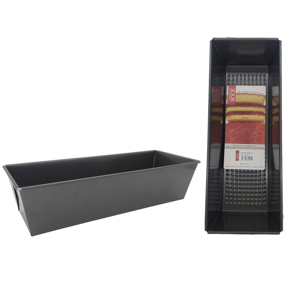 (Molde rectangular, ideal para preparar budines, tortas, flanes y otras recetas que requieran cocción en horno.Su diseño rectangular y profundo permite una cocción uniforme de la masa.Es de la marca Crystal Rock y cuenta con revestimiento antiadherente de teflón, que facilitan el desmolde de las preparaciones una vez cocidas y también su limpieza. Sus dimensiones son de aproximadamente 31 cm de largo, 11,5 cm de ancho y 7 cm de alto).