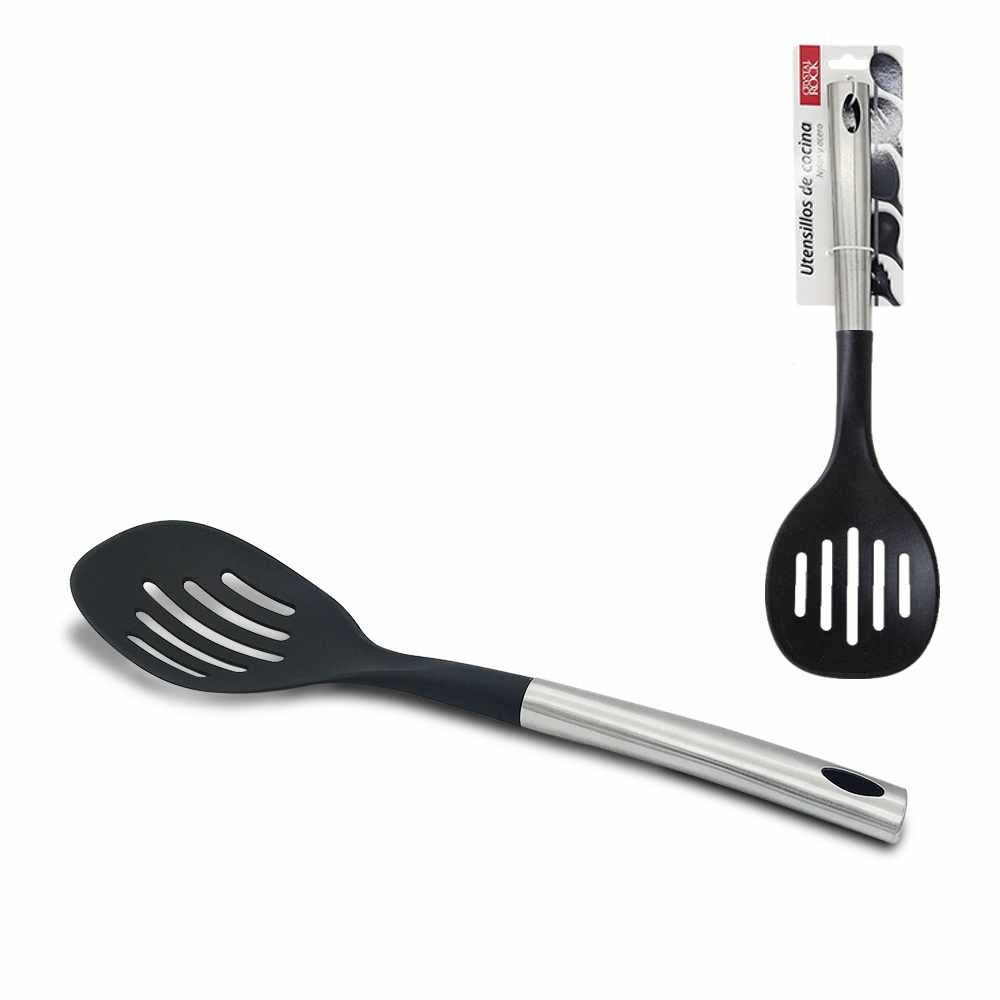 (La cuchara está fabricada con nylon resistente y un mango de acero inoxidable, lo que la hace duradera y apta para altas temperaturas. Su diseño calado permite escurrir líquidos eficientemente, siendo ideal para servir o cocinar alimentos).