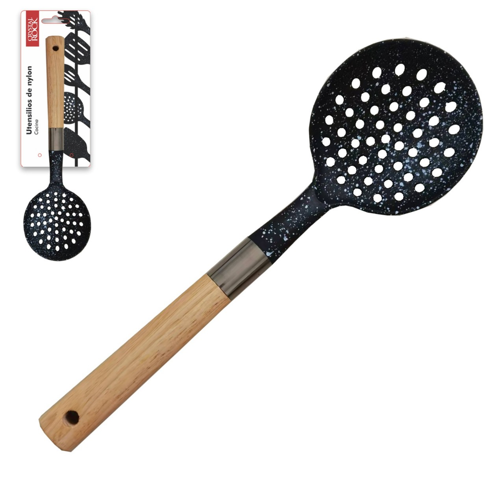 (Espumadera con mango de madera, la parte perforada es de nylon, ideal para usar con sartenes y ollas antiadherentes sin rayarlas. El mango es de madera. Se utiliza para escurrir líquidos al retirar alimentos fritos o cocidos, como pasta o frituras. Los utensilios de nylon son resistentes a altas temperaturas, pero se debe evitar la exposición directa a fuentes de calor para prevenir deformaciones. El nylon no absorbe olores y se puede lavar fácilmente, incluso en lavavajillas, lo que lo hace muy higiénico).