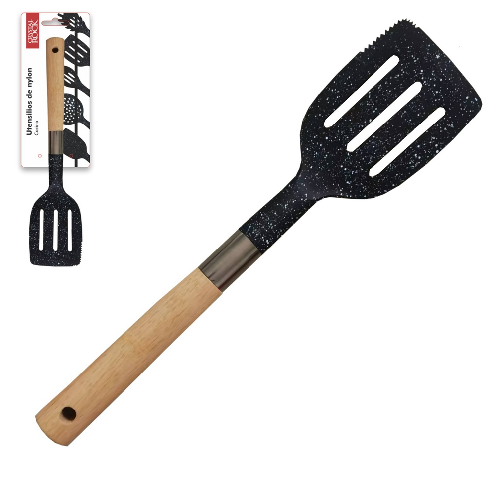 (Espátula ranurada fabricada en nylon, lo que la hace ideal para usar en sartenes y ollas antiadherentes sin rayar sus superficies. Sirve para voltear y transferir alimentos, así como para otras tareas culinarias diarias. Los utensilios de nylon son conocidos por su durabilidad y resistencia a altas temperaturas, aunque se recomienda no exponerlos directamente a fuentes de calor extremas para evitar deformaciones. El nylon no absorbe olores ni humedades y es fácil de limpiar, incluso en lavavajillas).