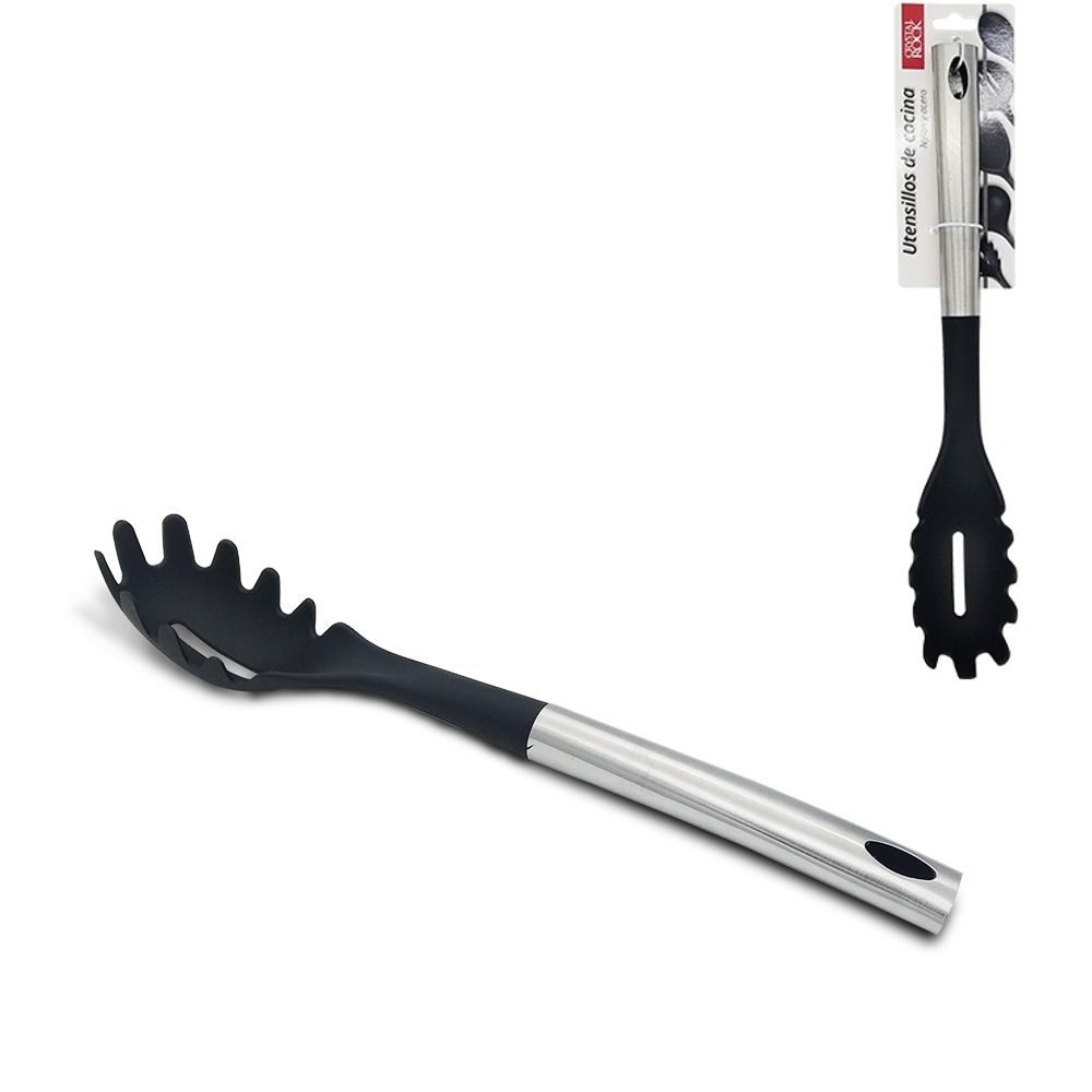 (Cuchara diseñada específicamente para manipular y servir espaguetis y otras pastas largas con facilidad, cumpliendo varias funciones. Su diseño con dientes o puntas alrededor del borde ayuda a atrapar y servir los fideos largos sin que se resbalen. El orificio central y/o pequeños agujeros en la superficie permiten drenar el agua de cocción al sacar la pasta de la olla. El orificio central también sirve para medir una ración de espaguetis crudos, calculando la cantidad adecuada para una persona).